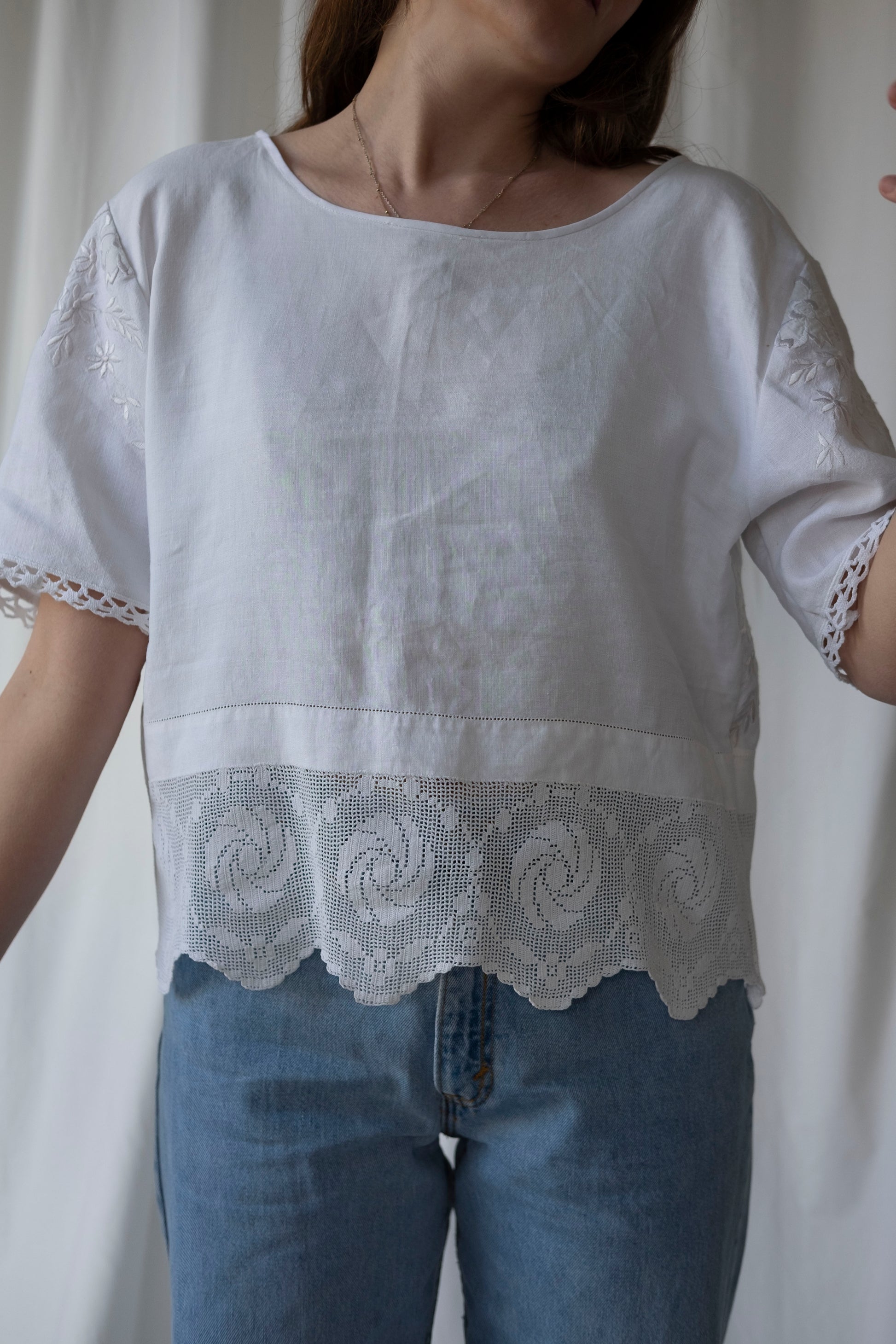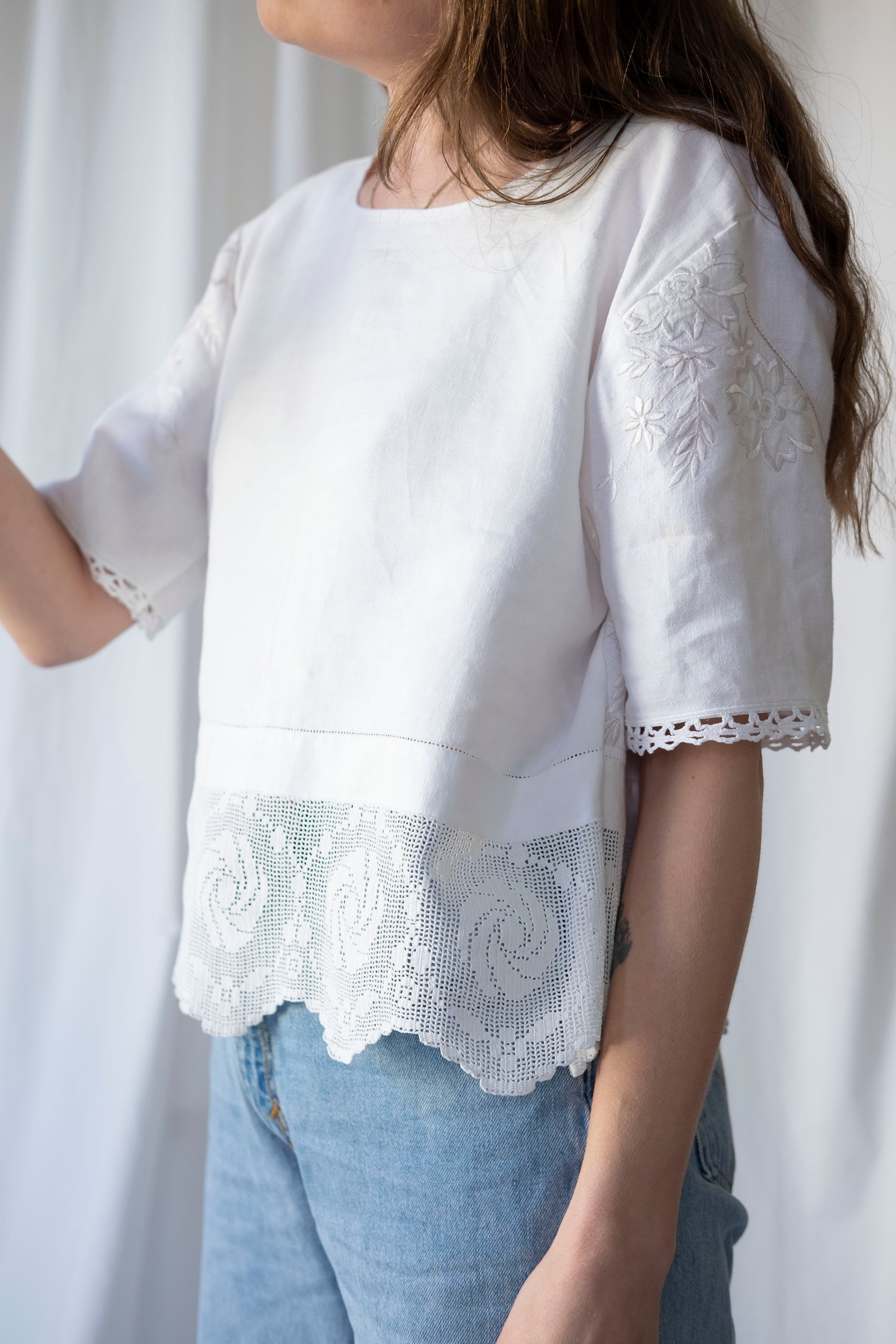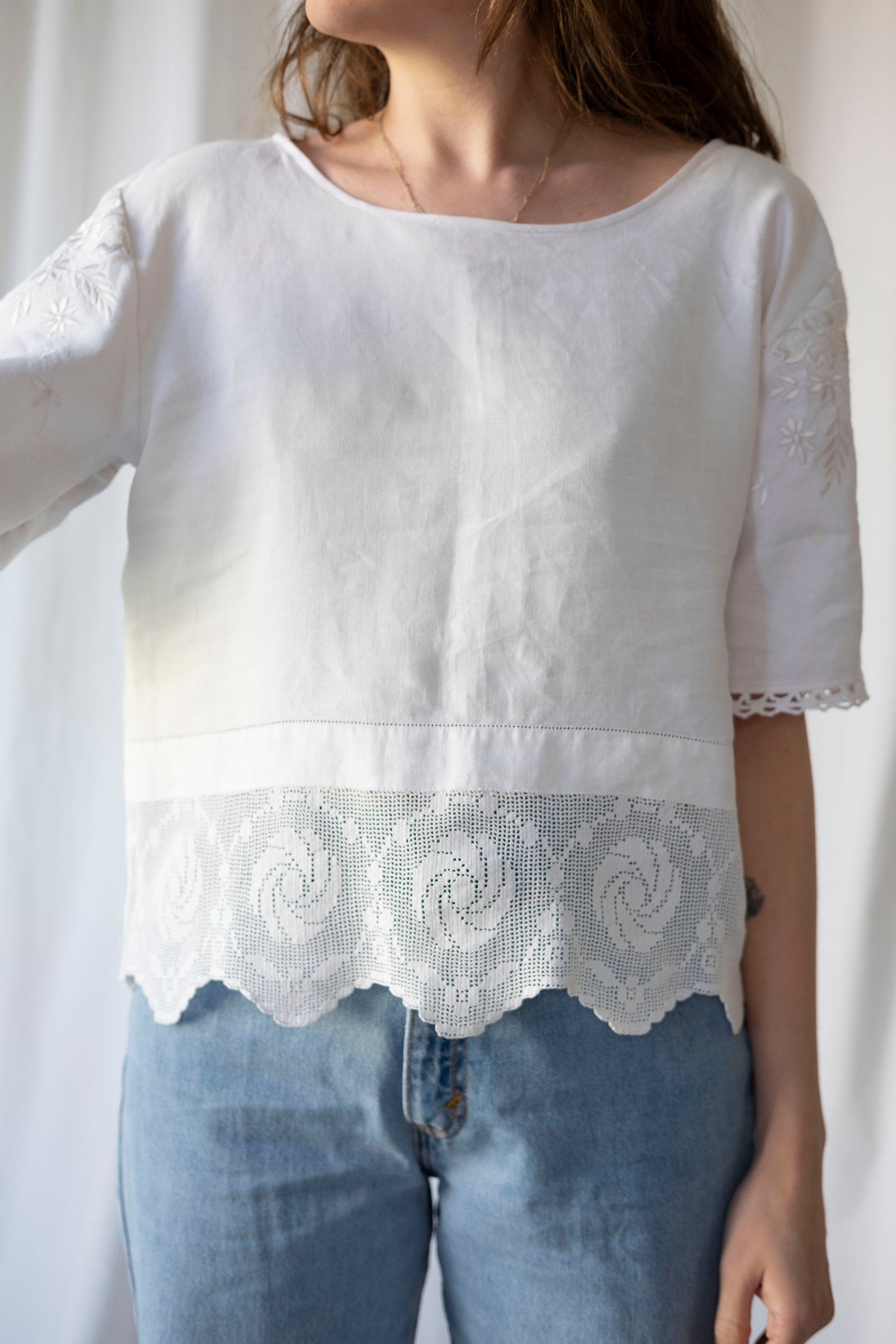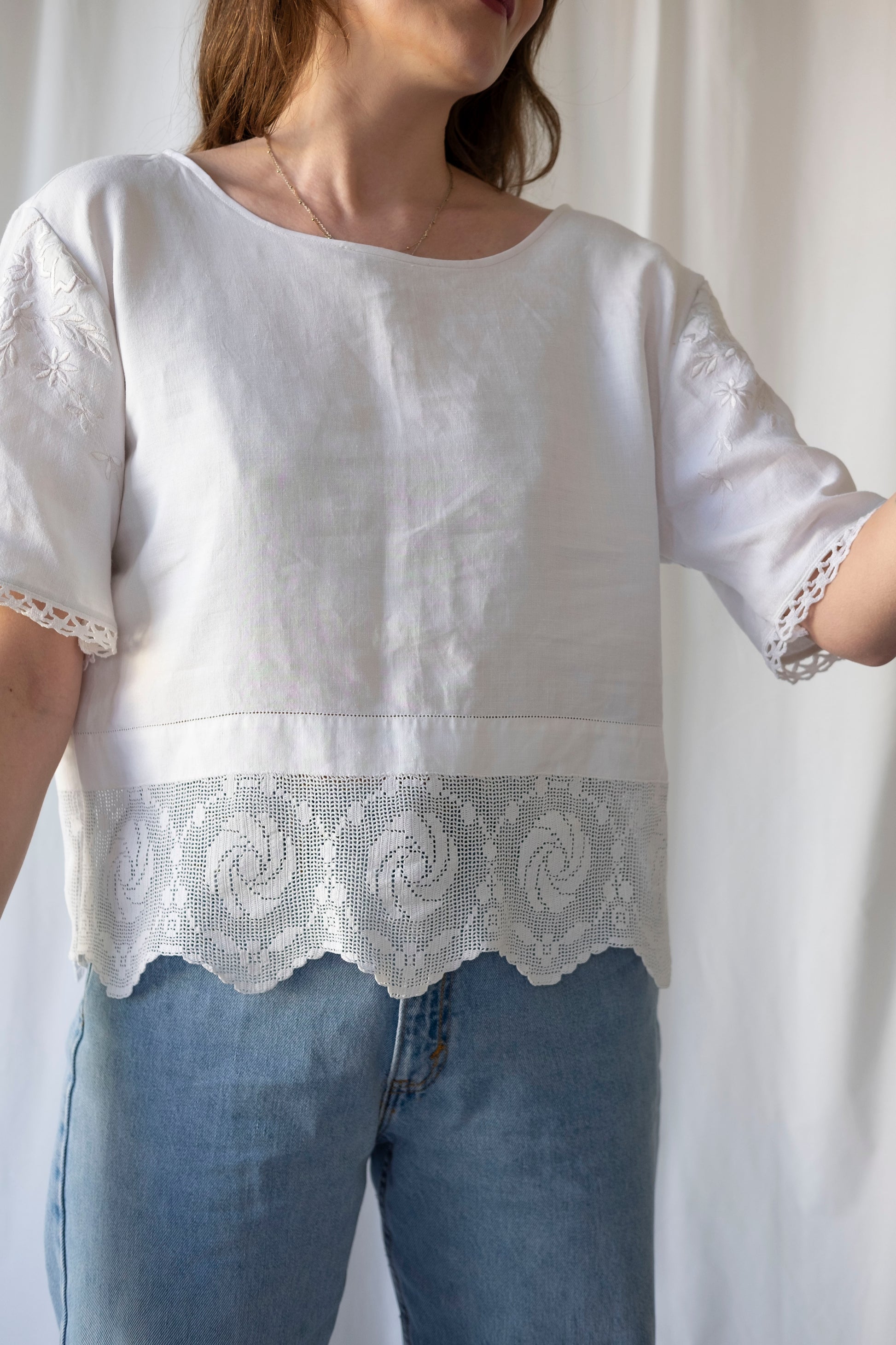 Primrose ~ Reworked Linen & Crochet Tee ~ M/L