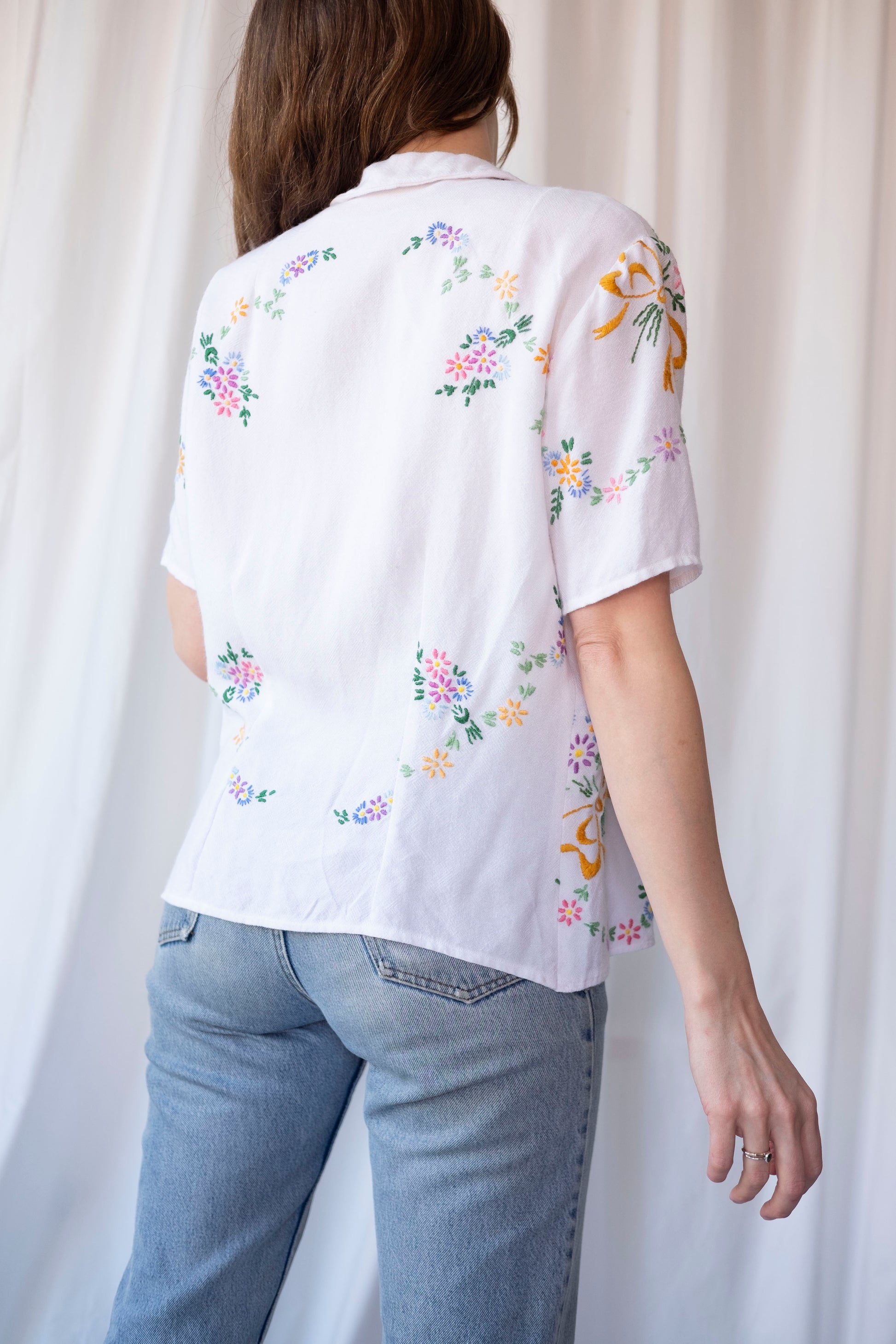 Gardenia ~ Reworked Embroidered Tablecloth Shirt ~ M