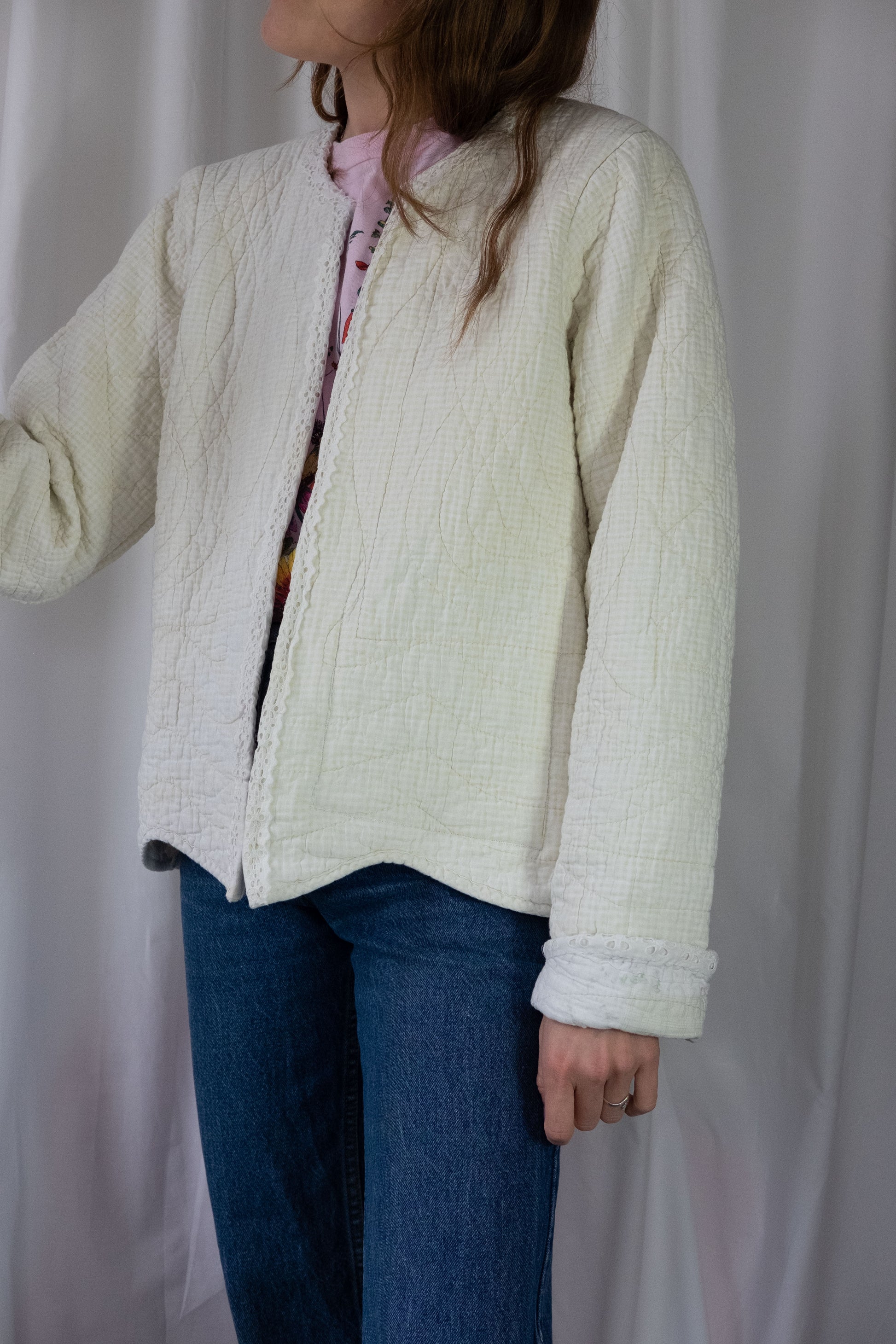 Open fronted, hems finished with antique lace.