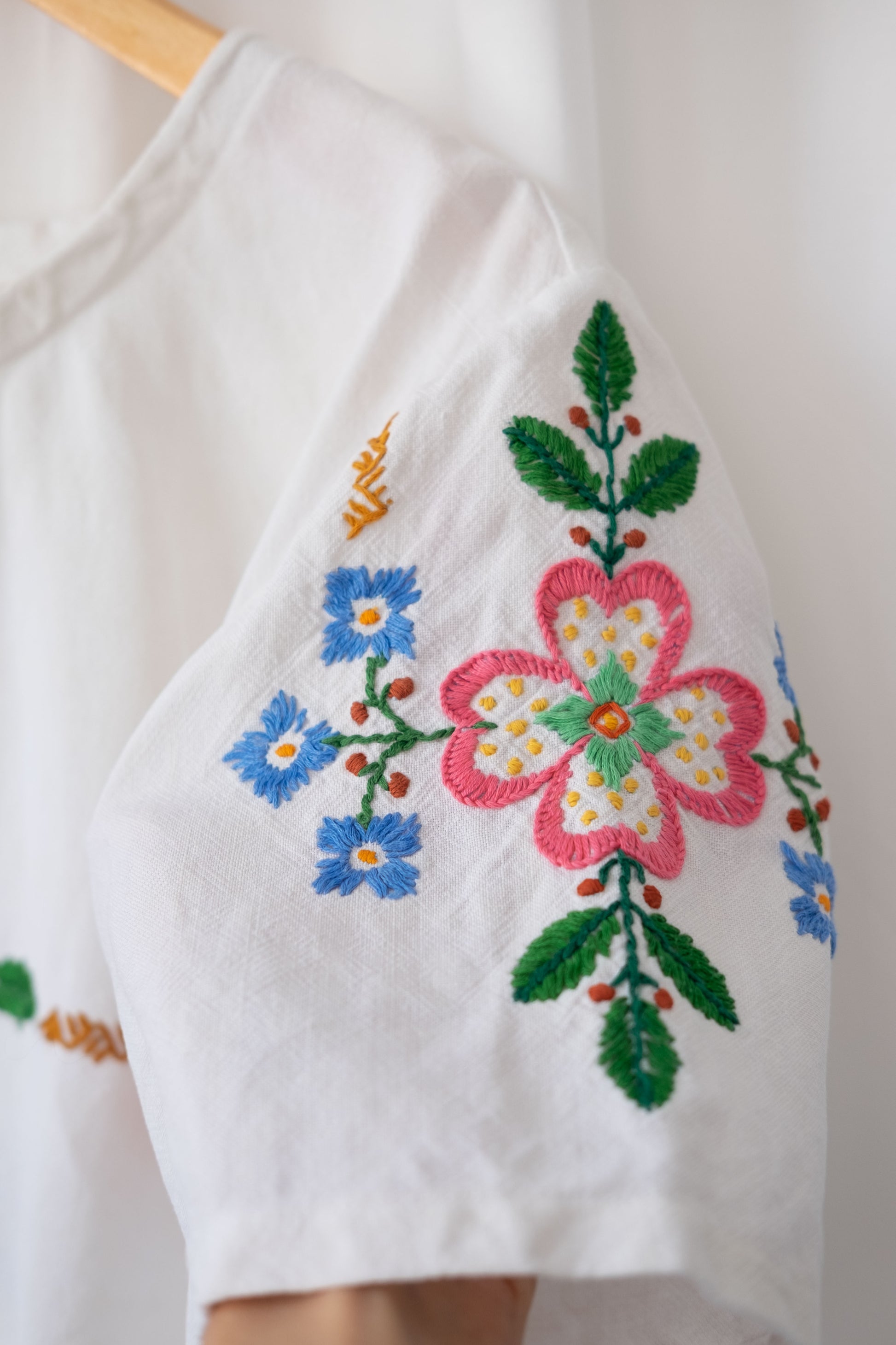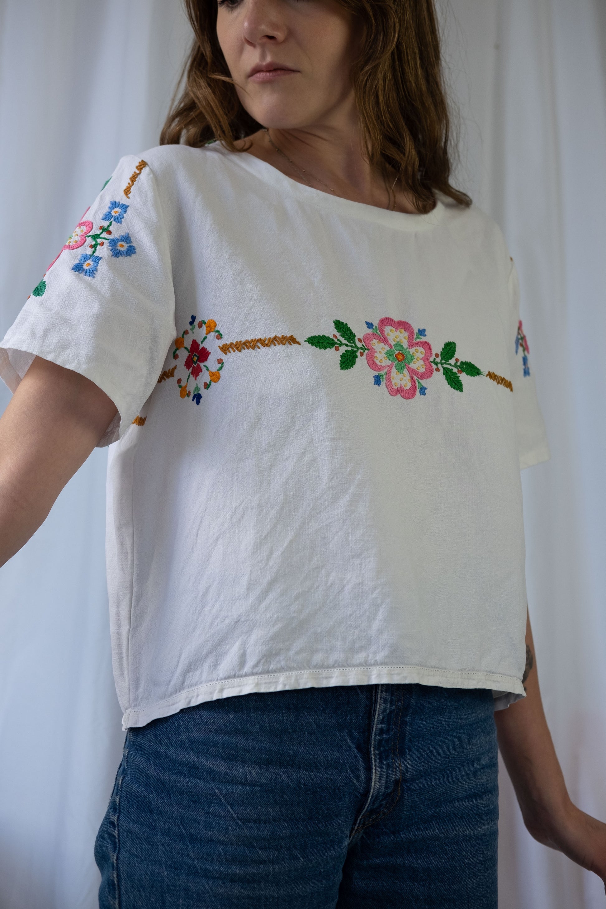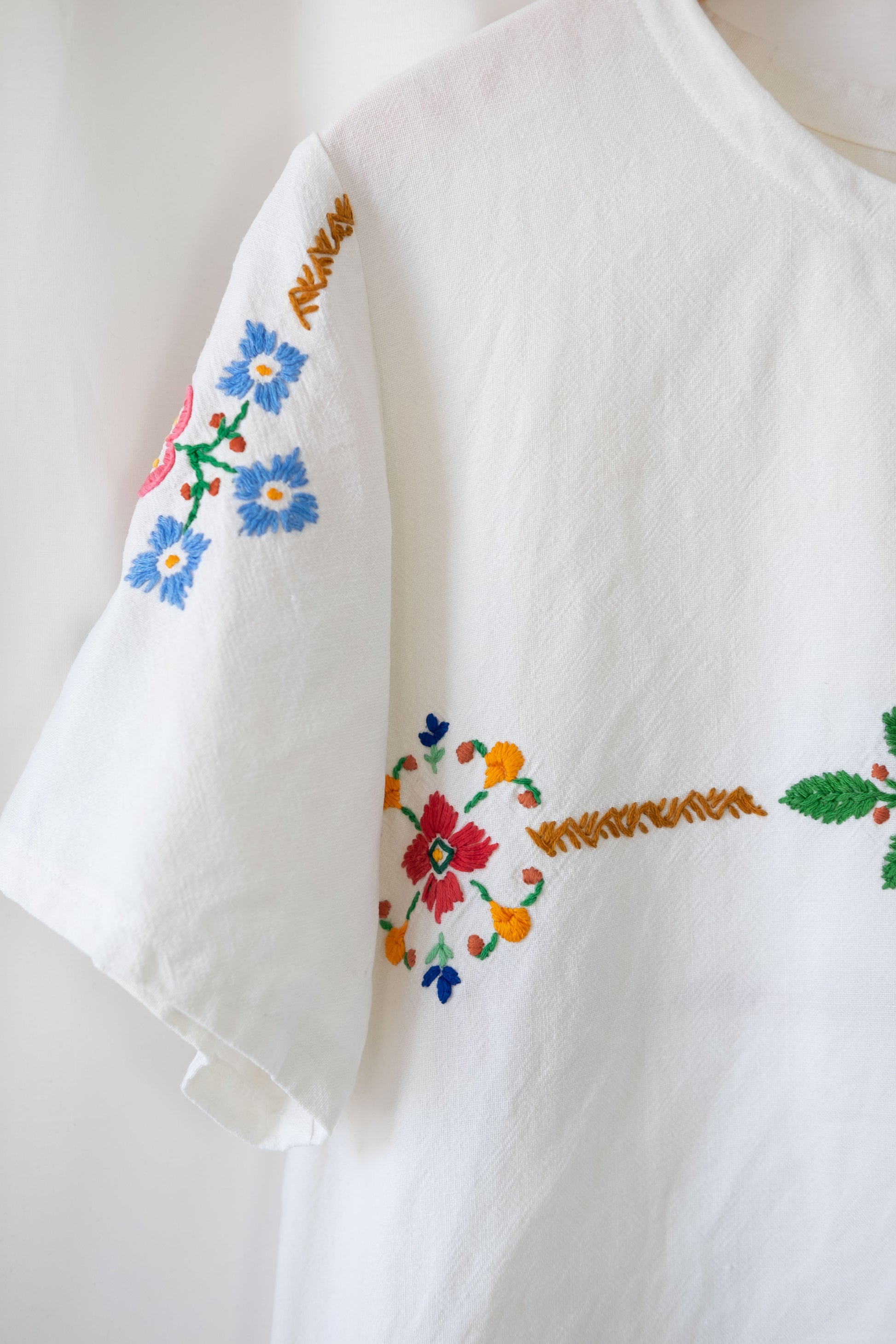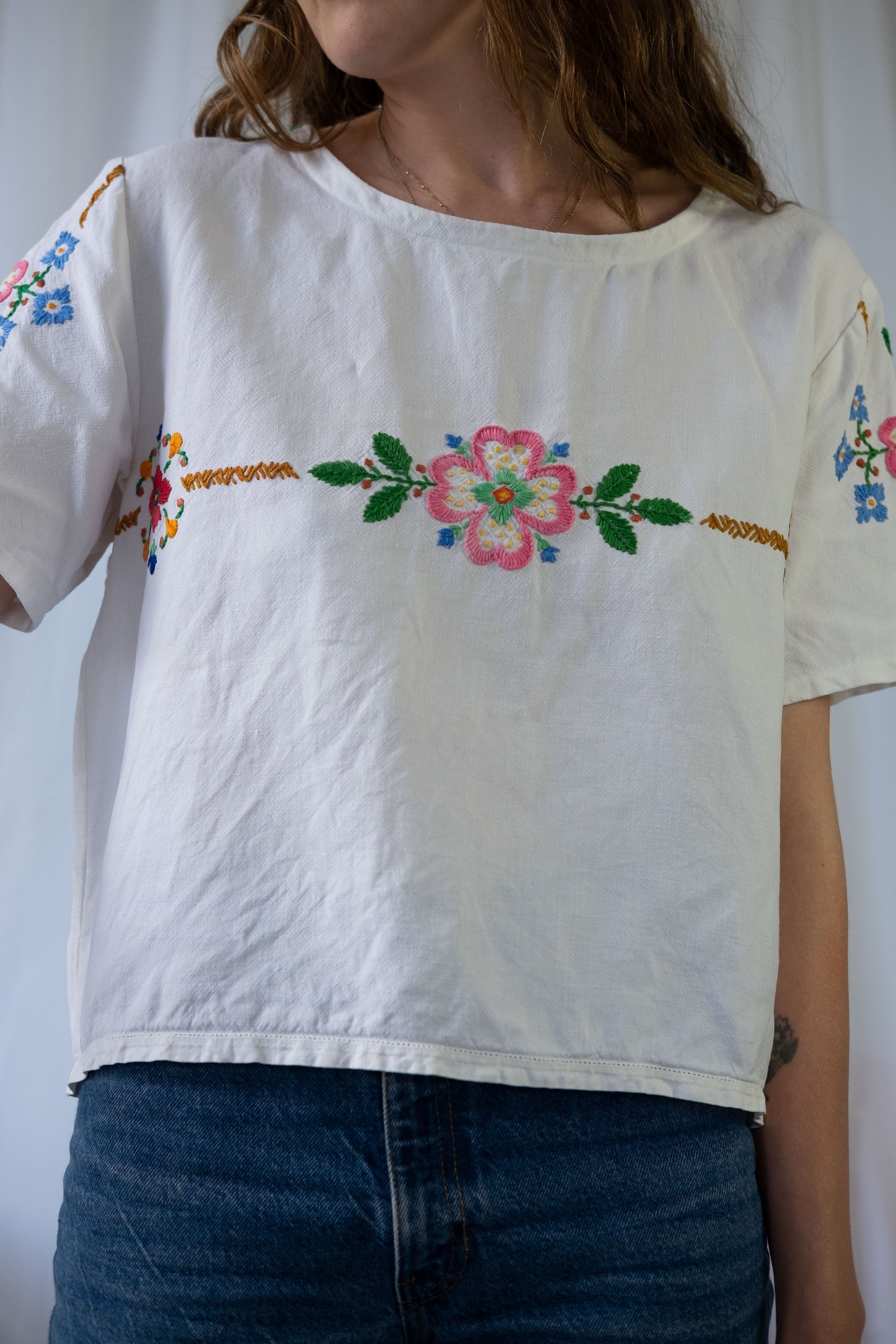 Dahlia ~ Reworked Vintage Linen Embroidered Tee - L