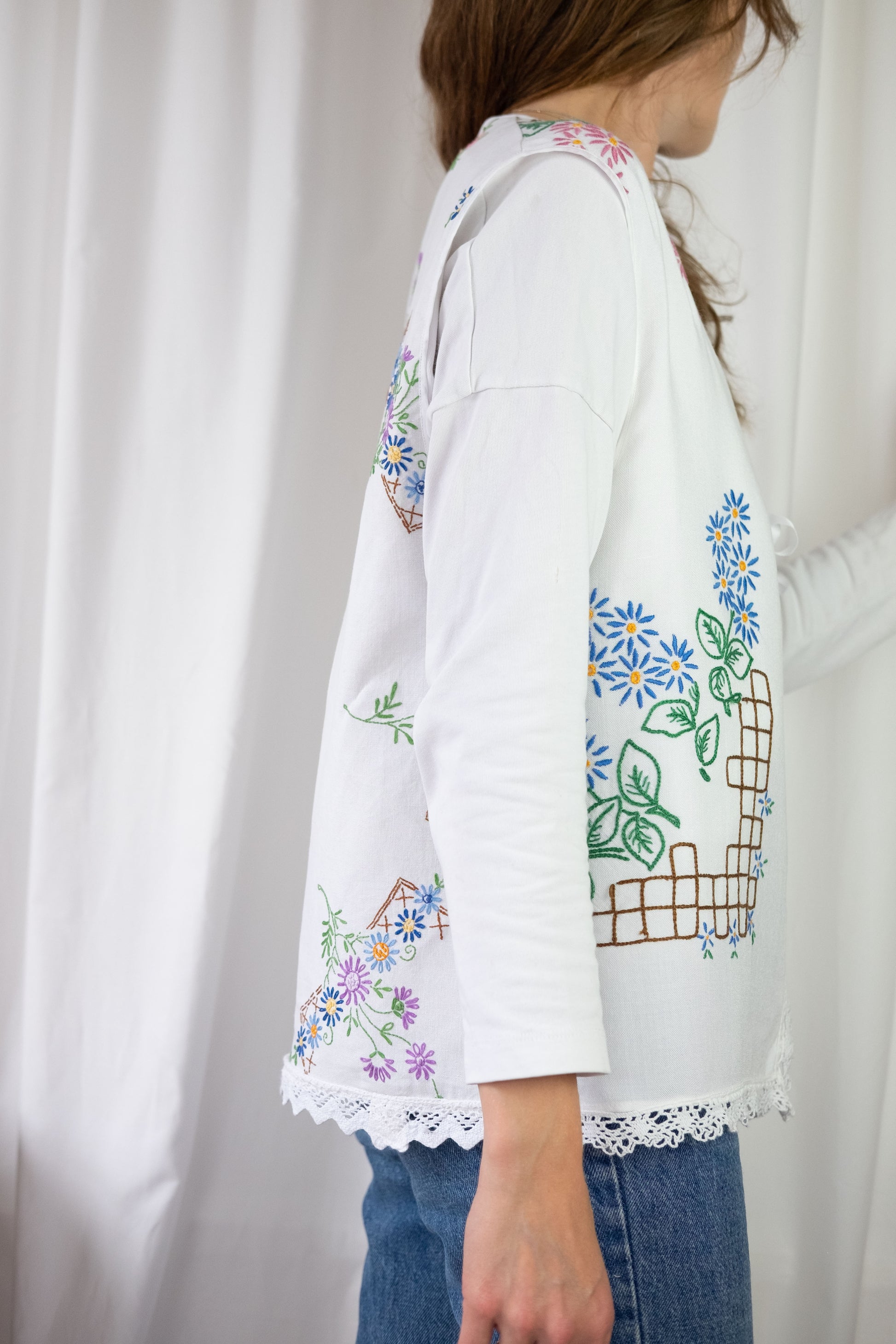 Loose Fit, Boxy Shape. Embroidered, Lace hem.