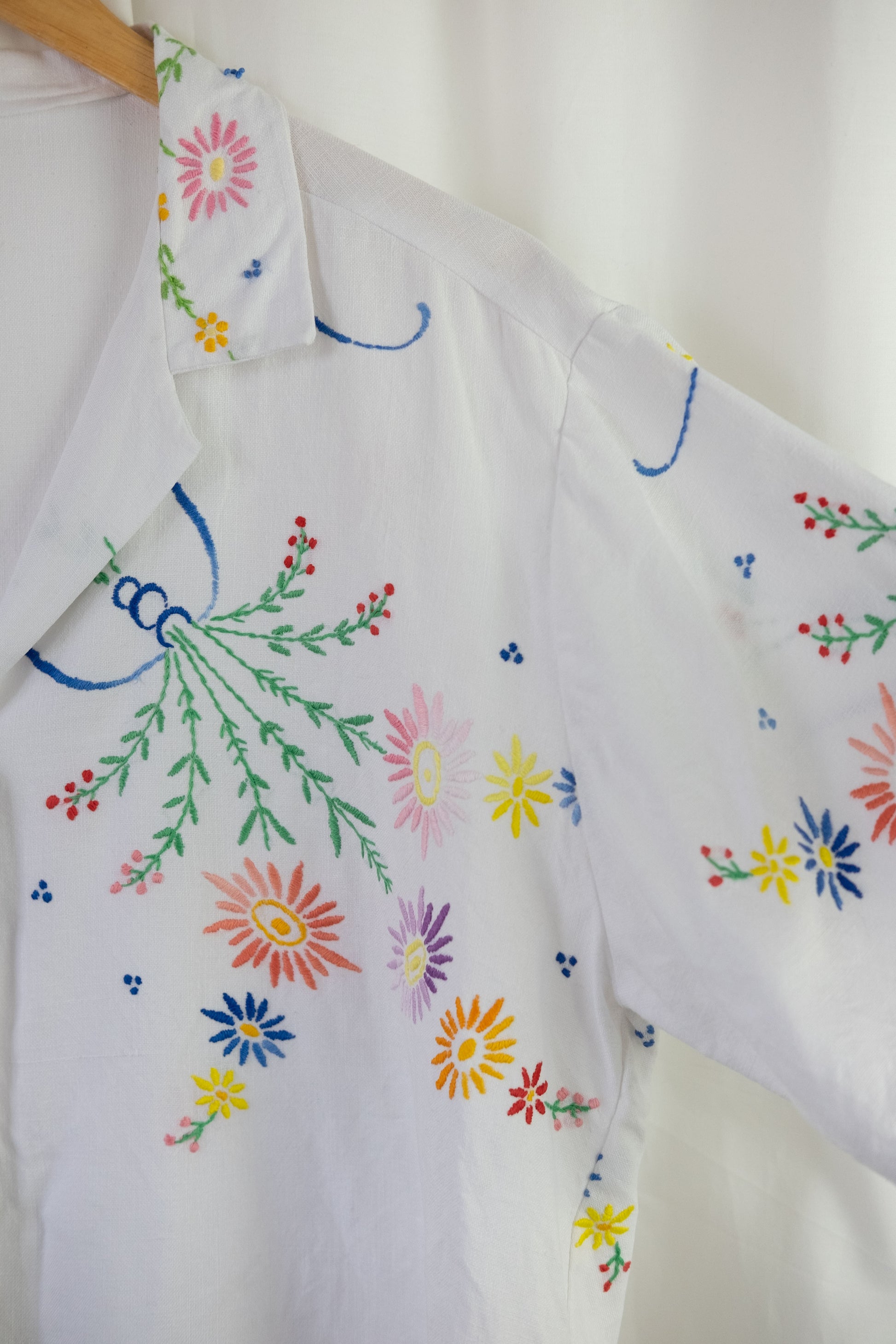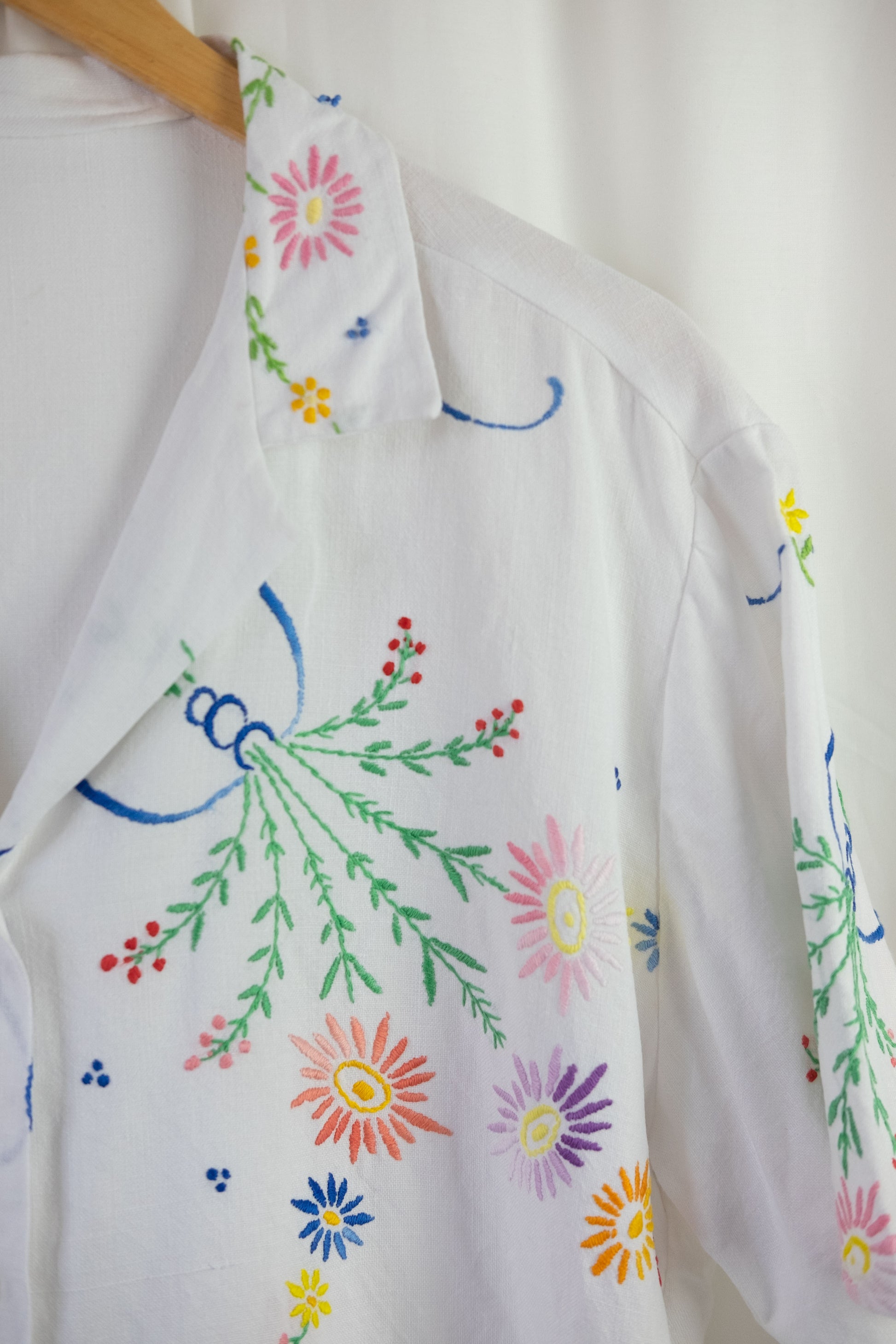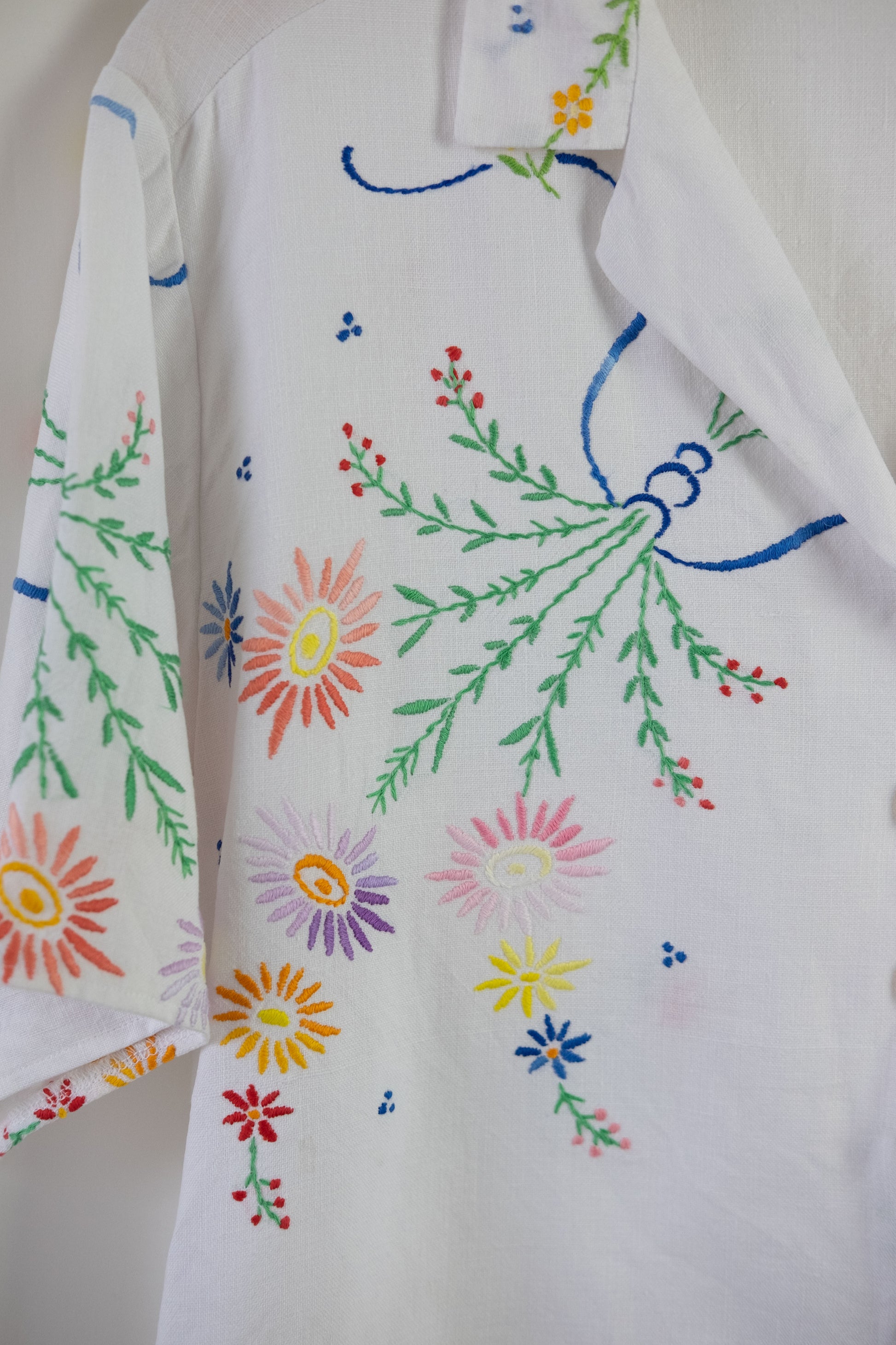 Freesia ~ Reworked Vintage Linen Embroidered Shirt - S/M