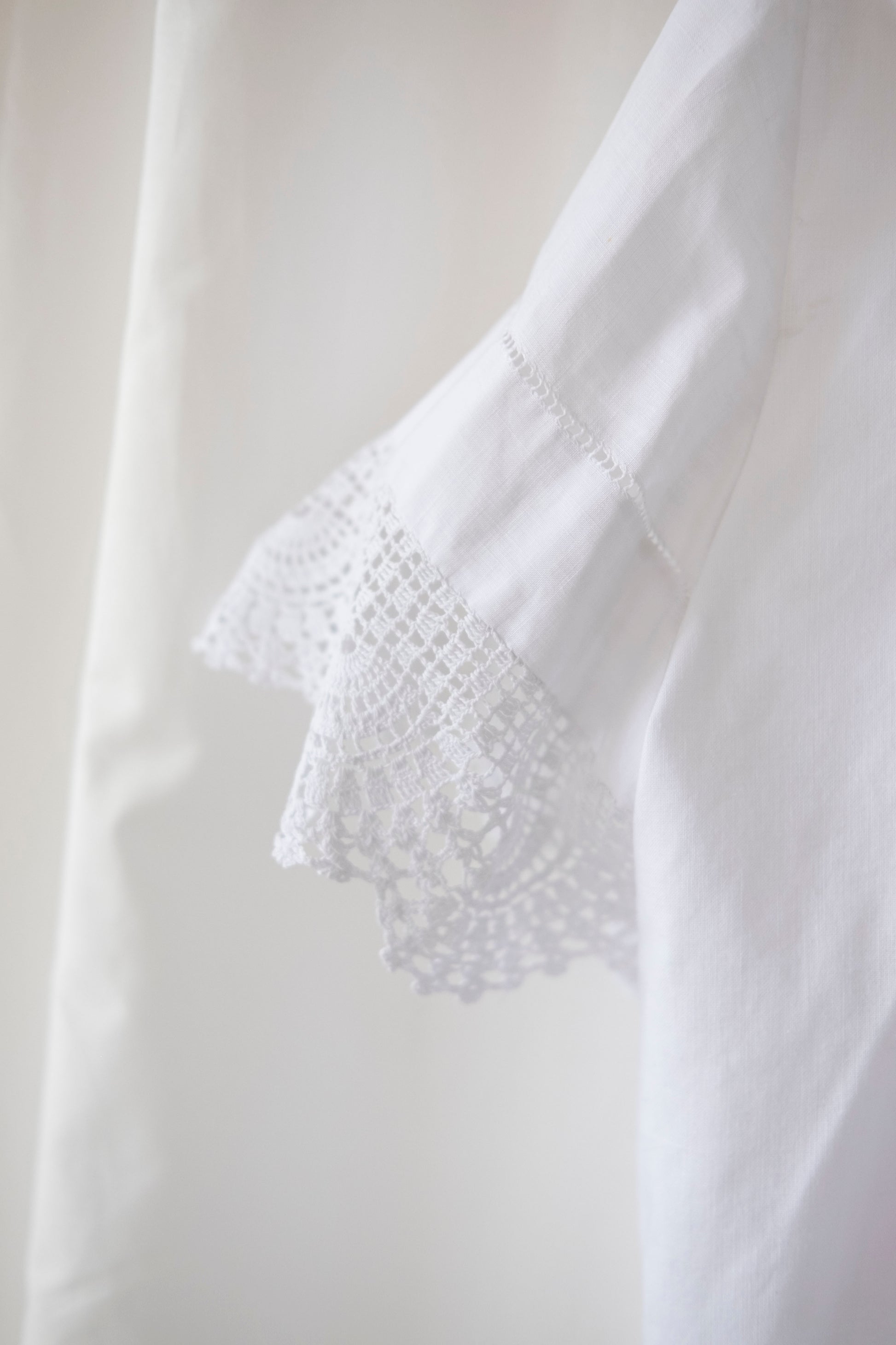 With some fabric patches. Lovely antique lace crochet hem sleeves.