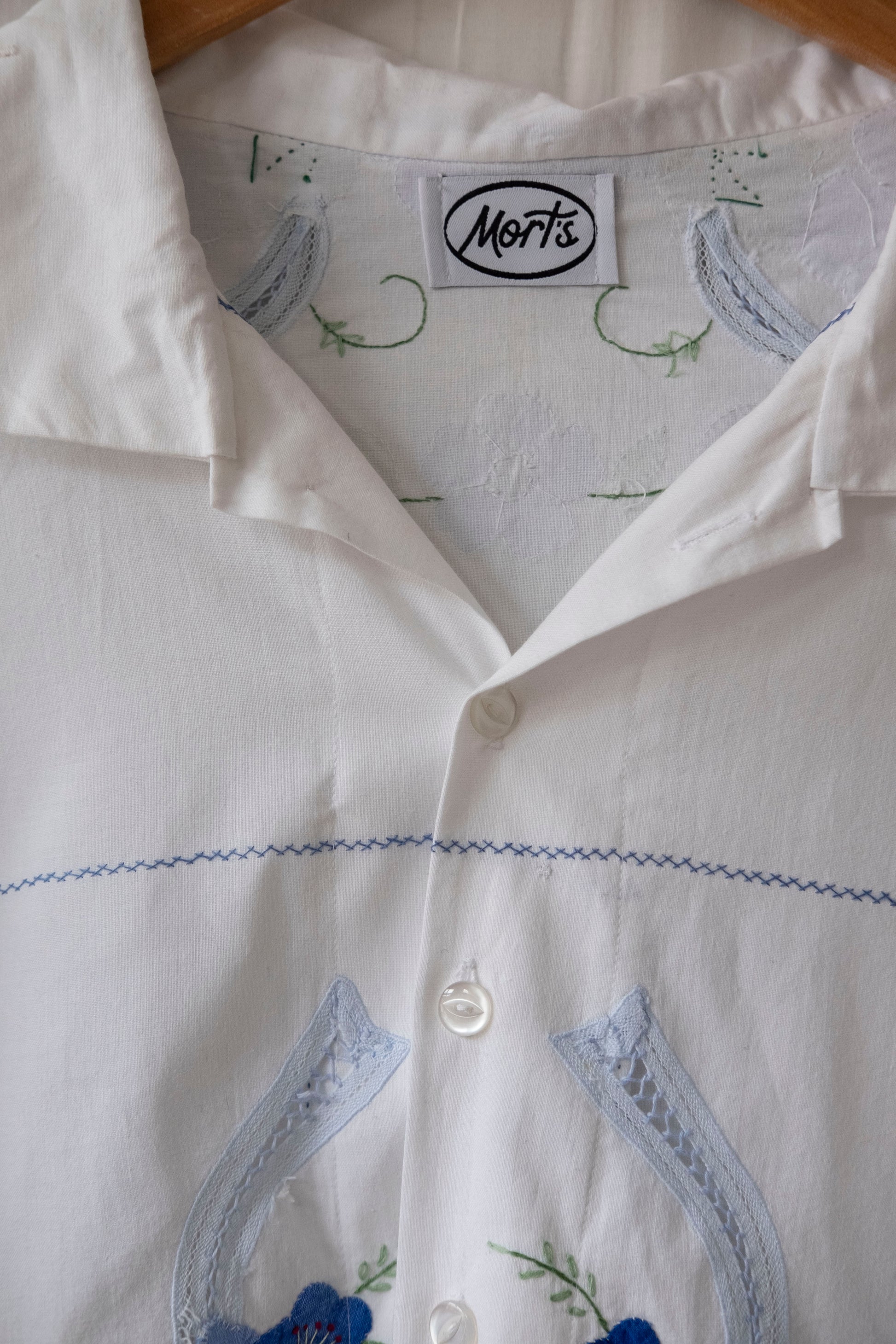 In white with stunning hand applique and embroidery in indigo blue and green.