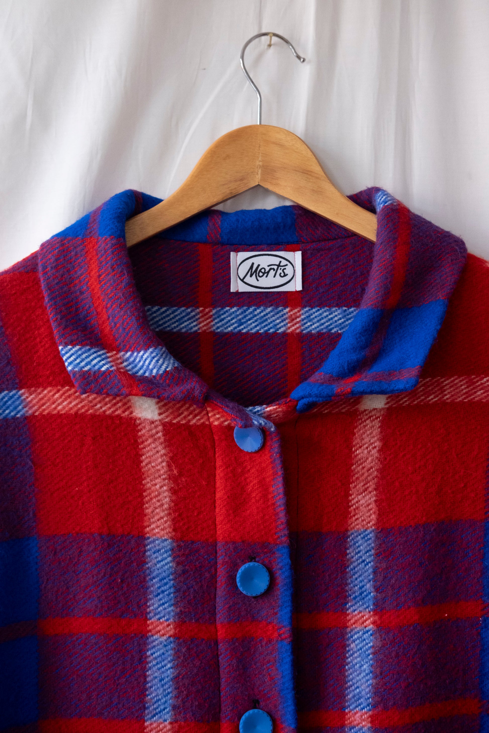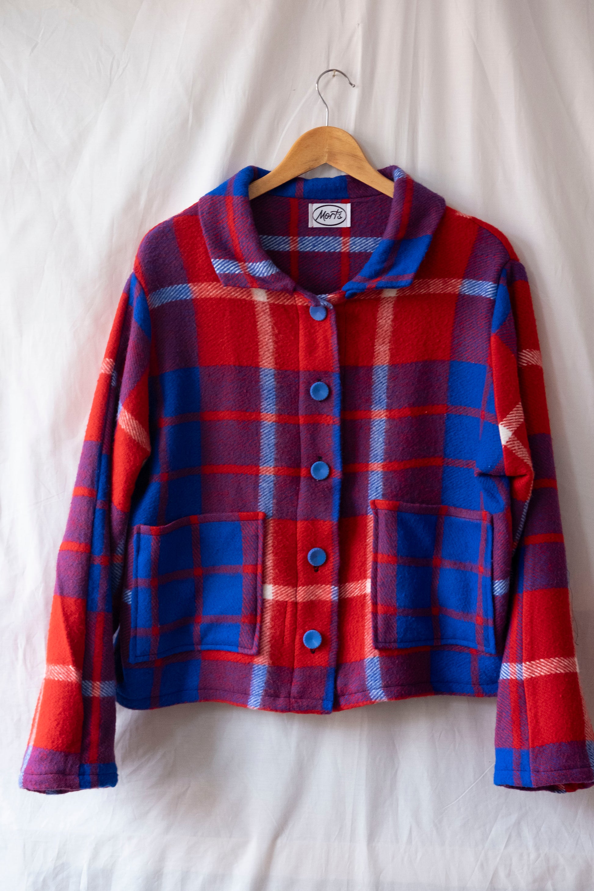 In a red and electric blue check. Cropped length.