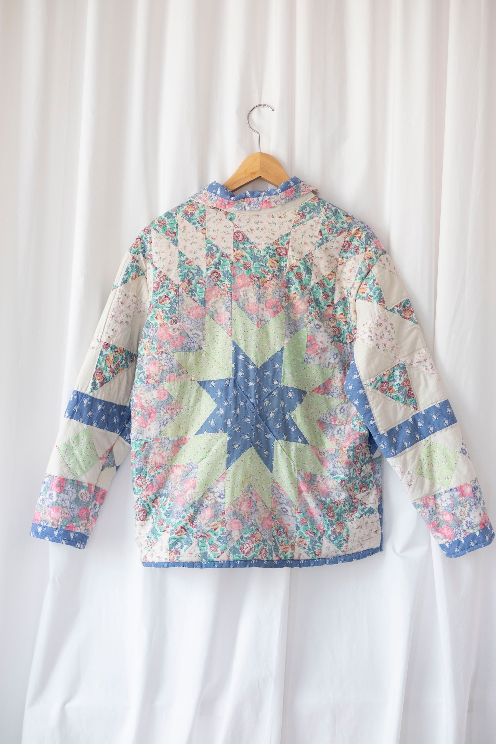 Patchwork star shapes in creams / blues & pinks with florals.