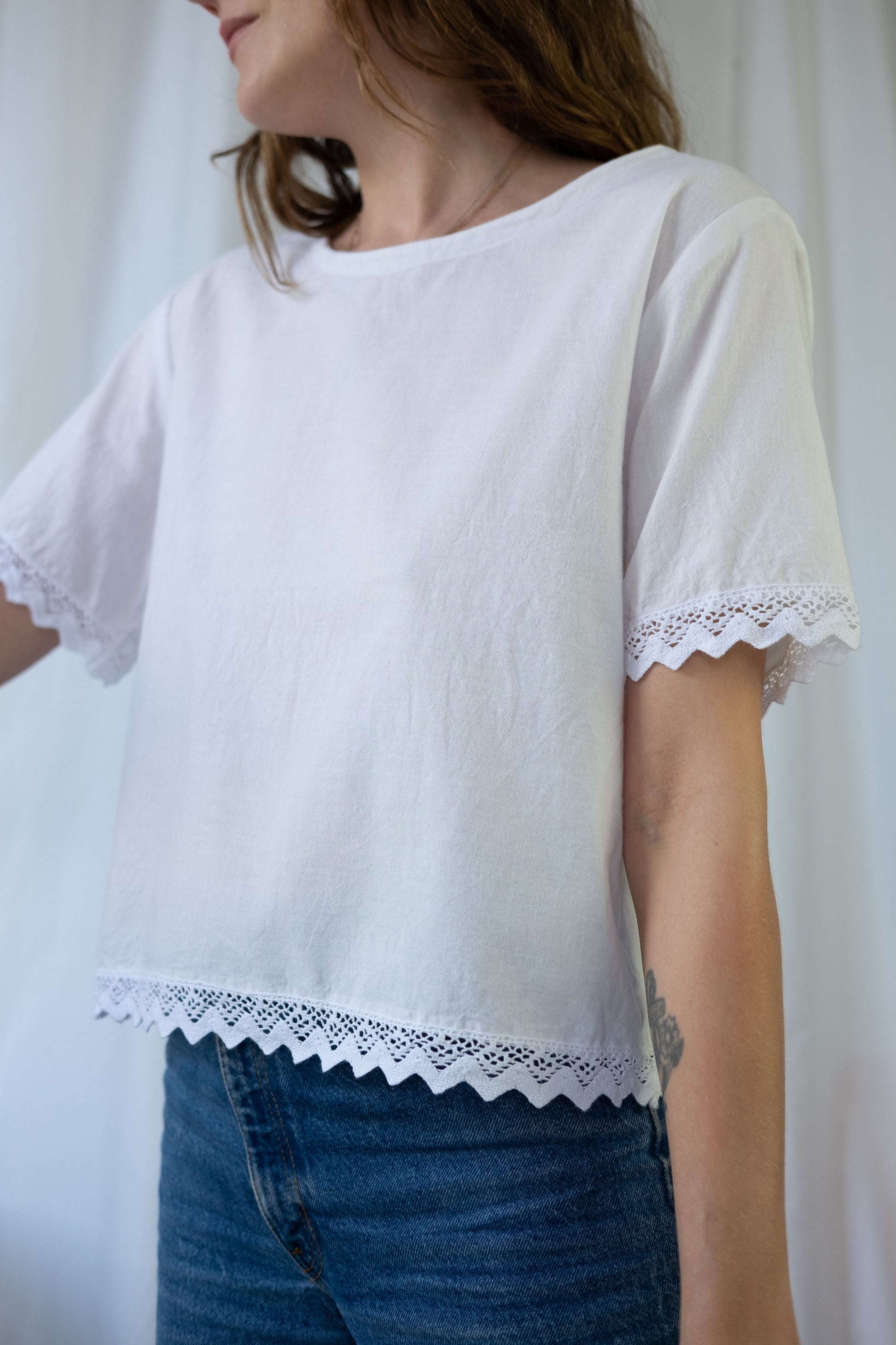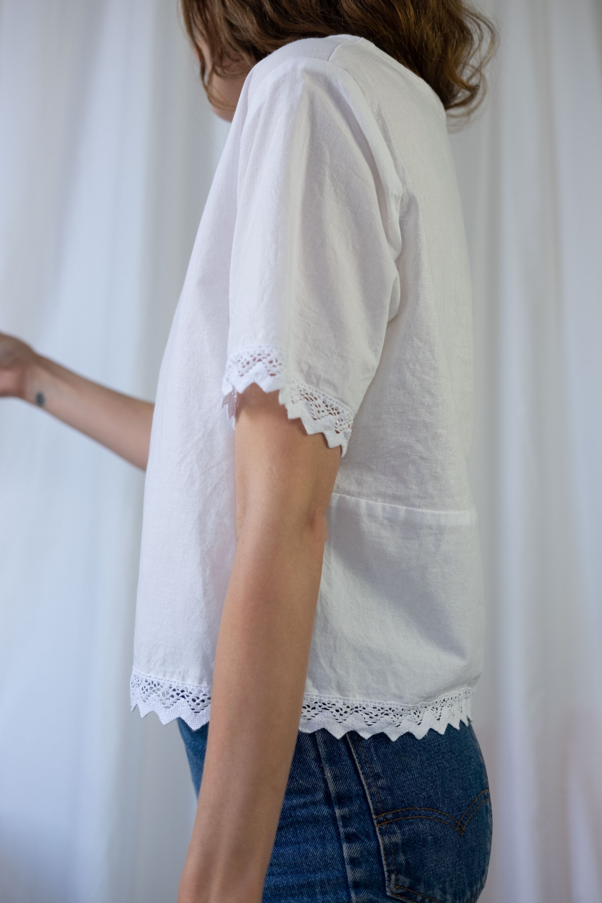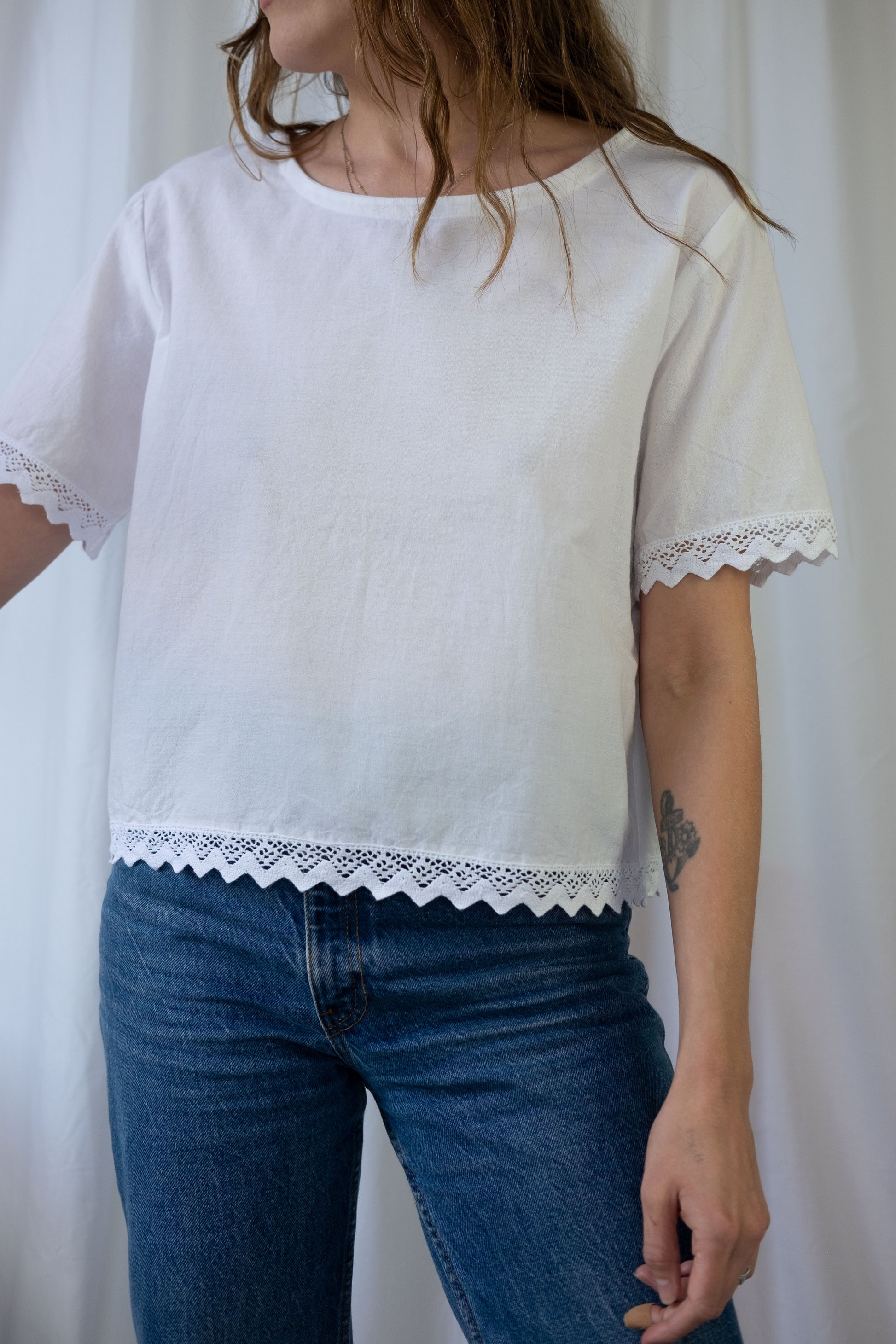 Jane ~ Reworked Vintage Linen Crochet Tee - M