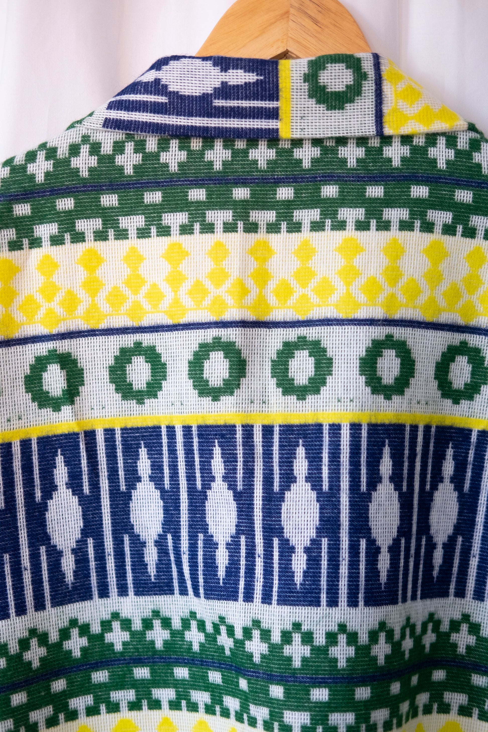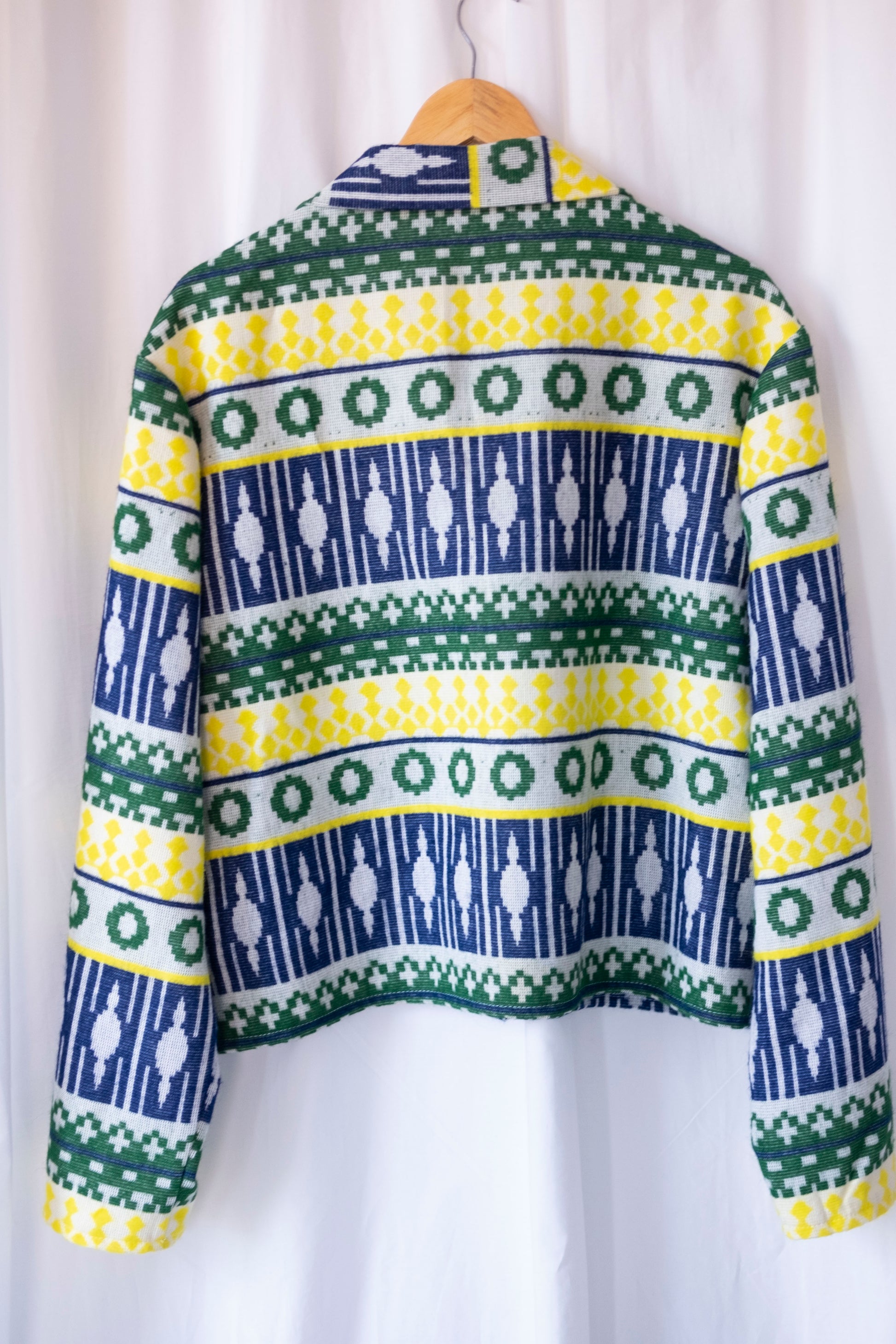 with fun woven pattern in forest green, navy & a pop of lemon.