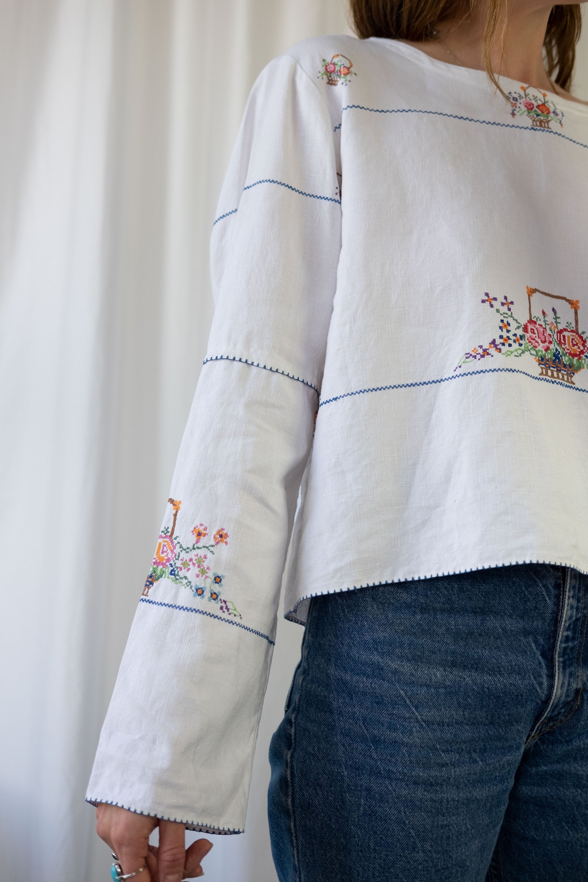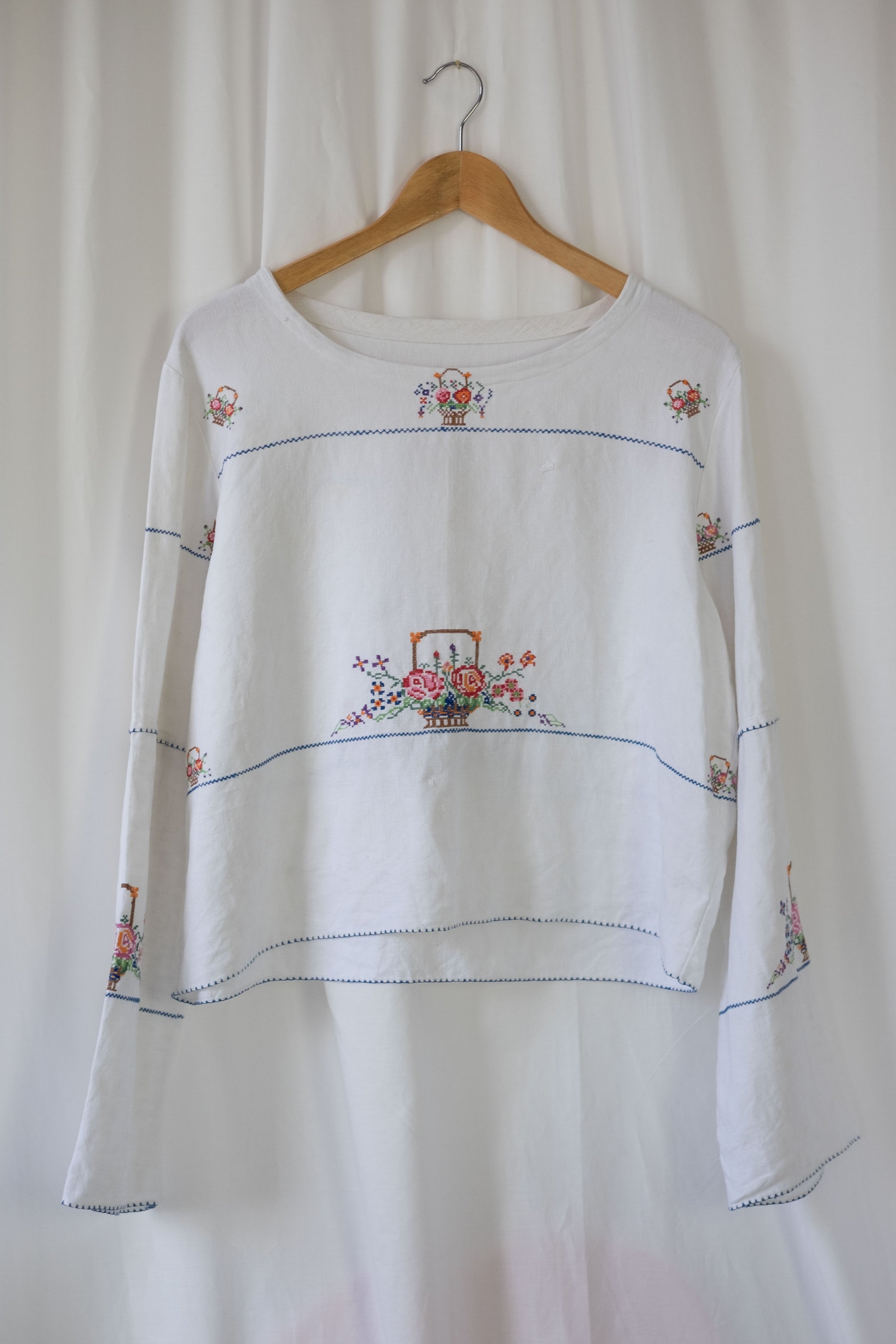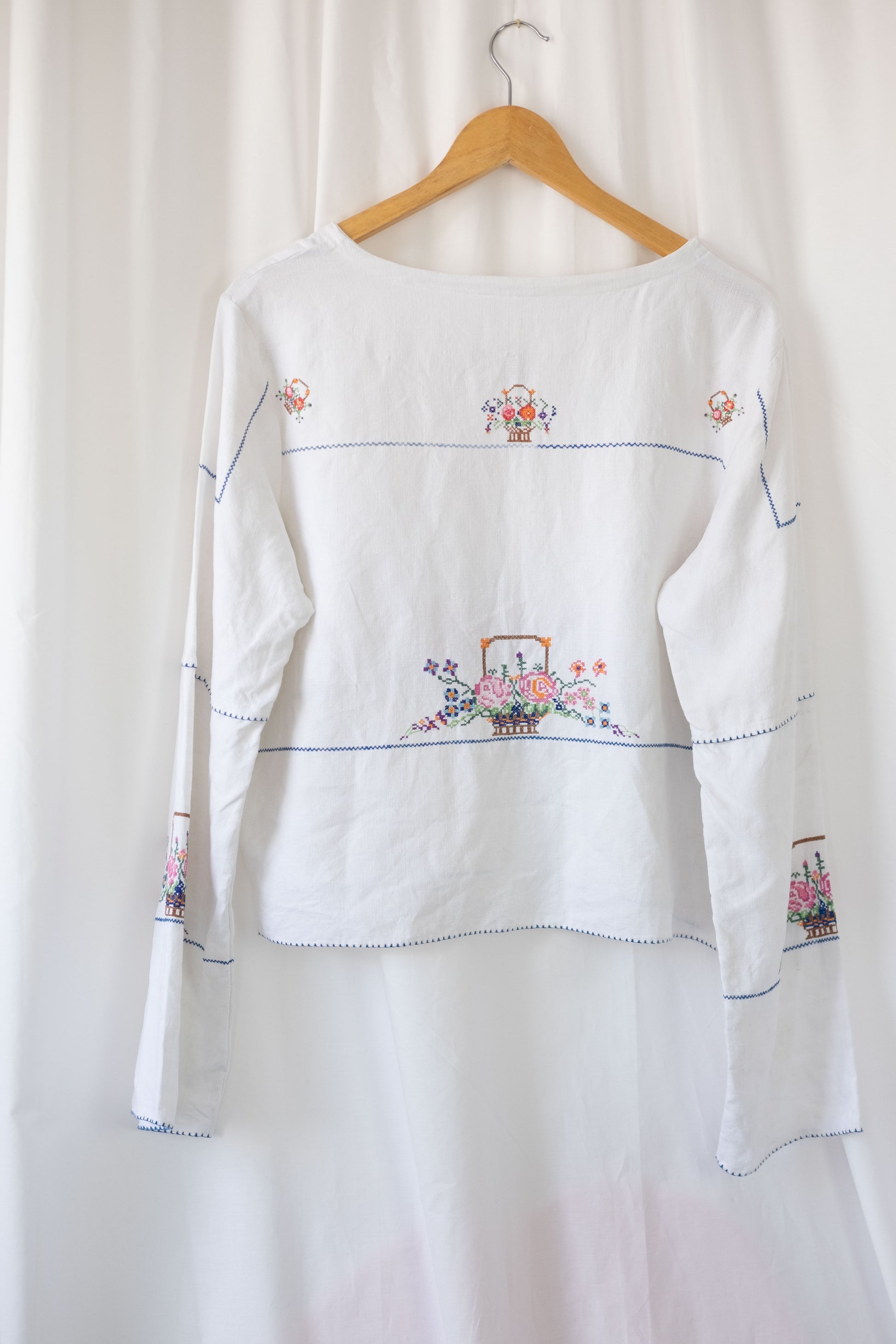 Rose ~ Reworked Vintage Linen Embroidered Long Sleeve - L