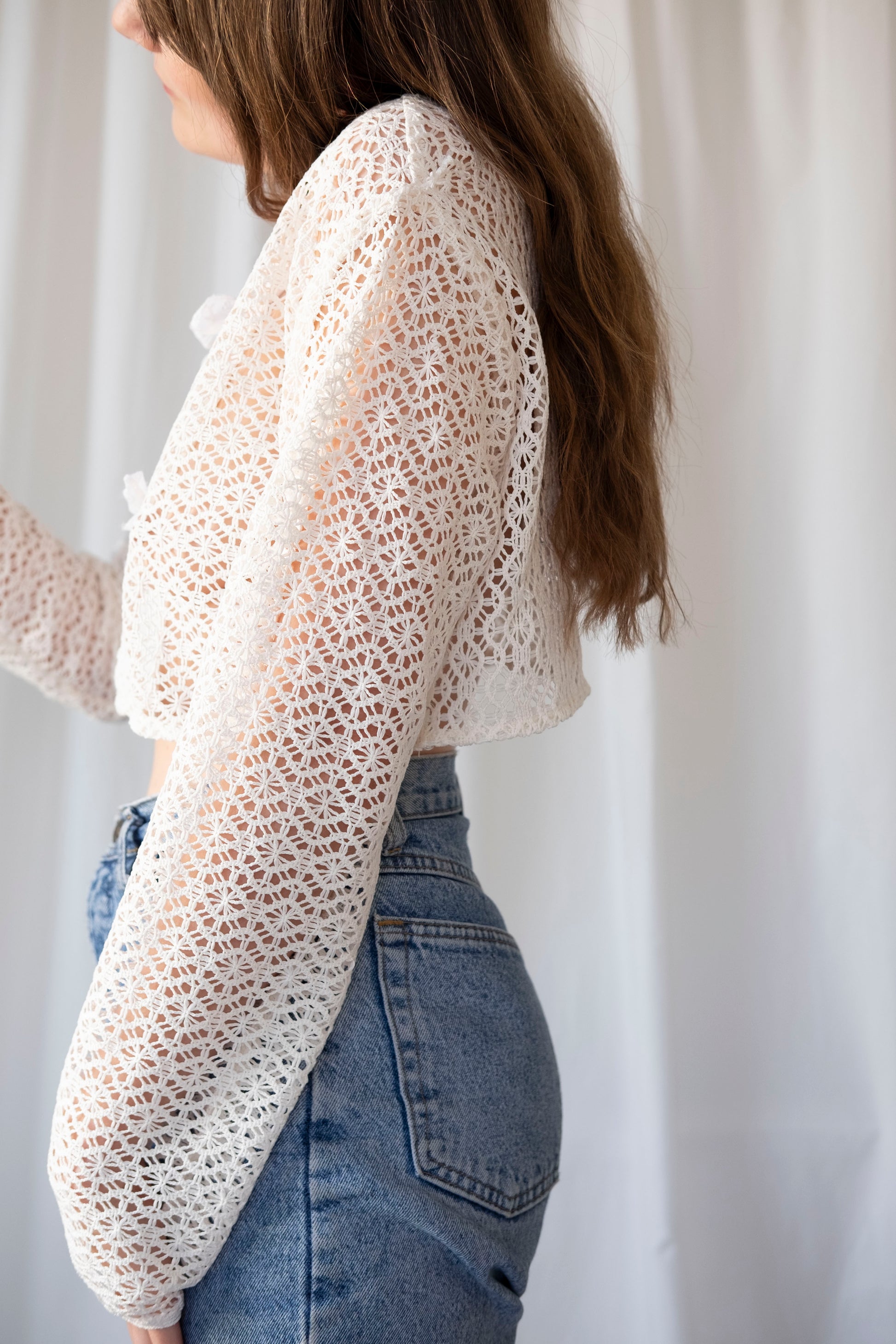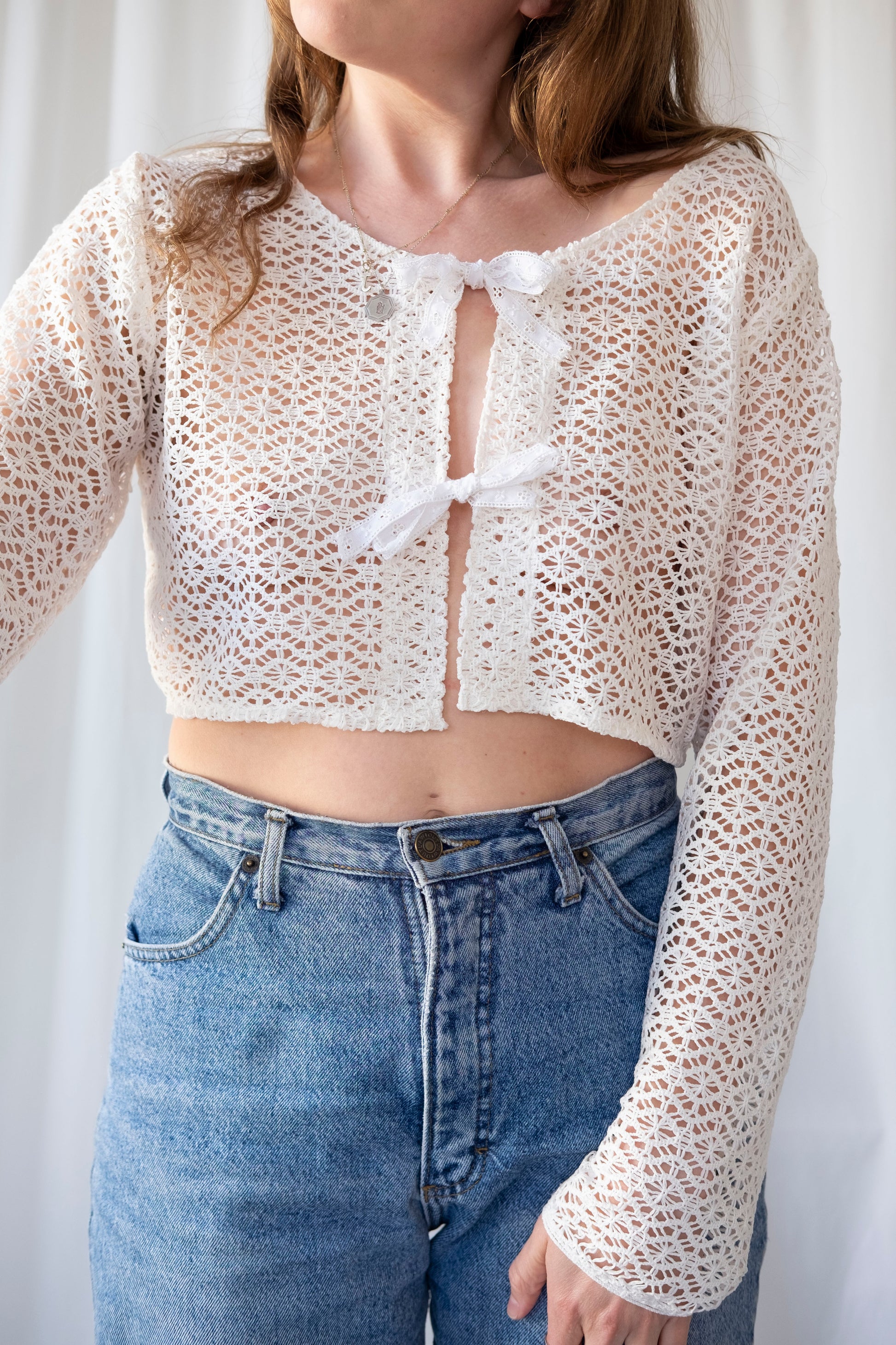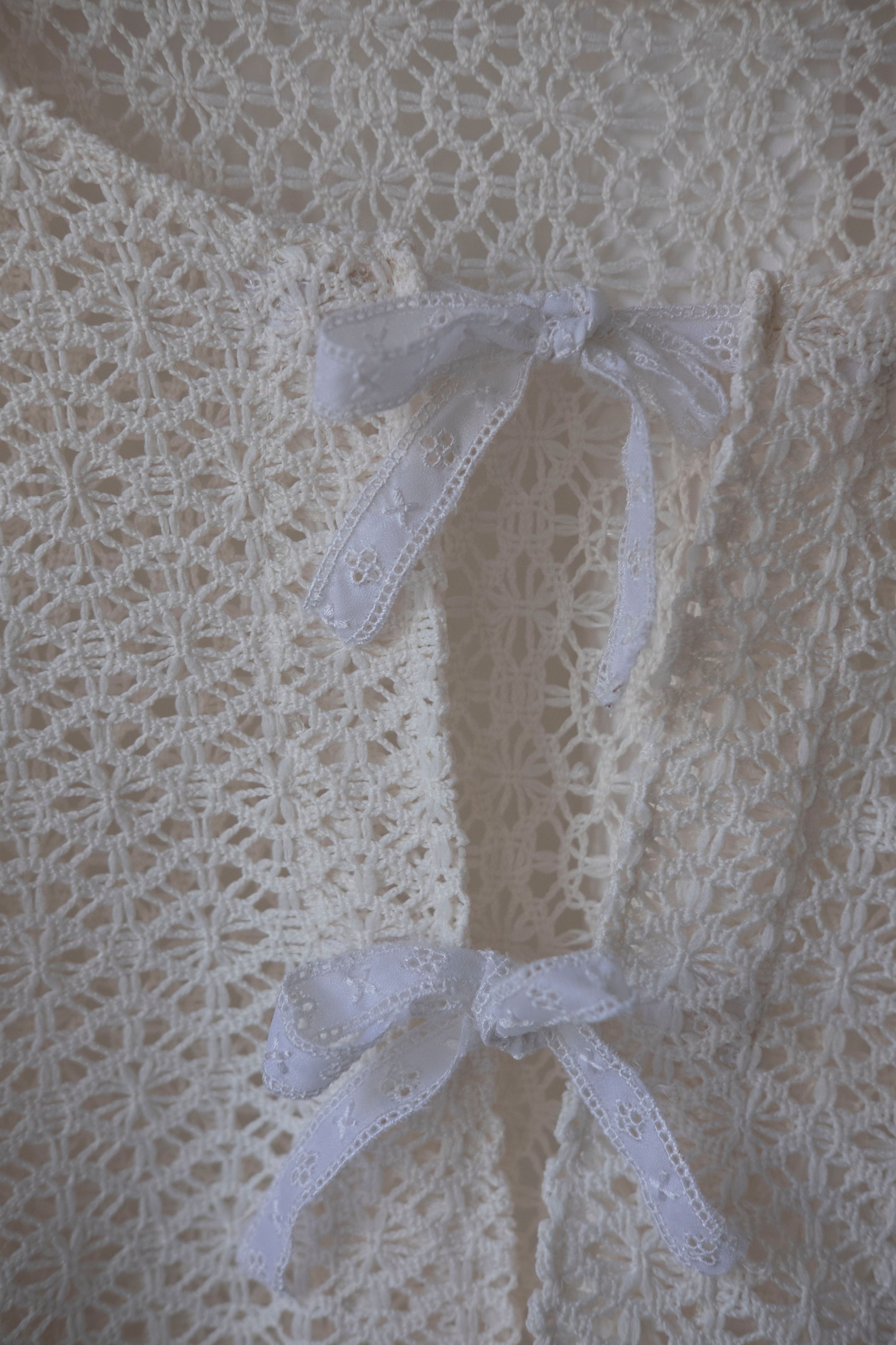 Fastens with antique lace bow ties.
