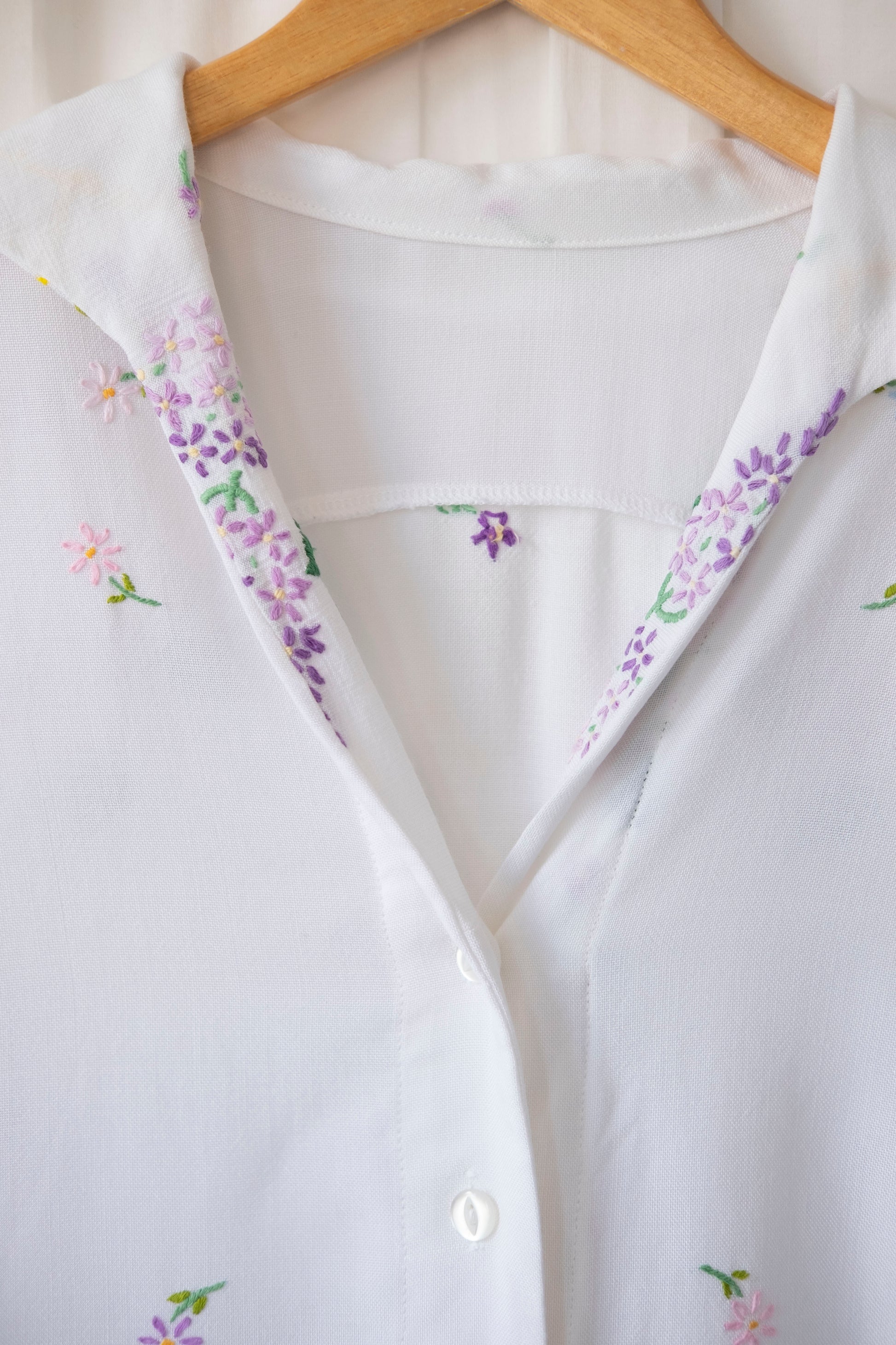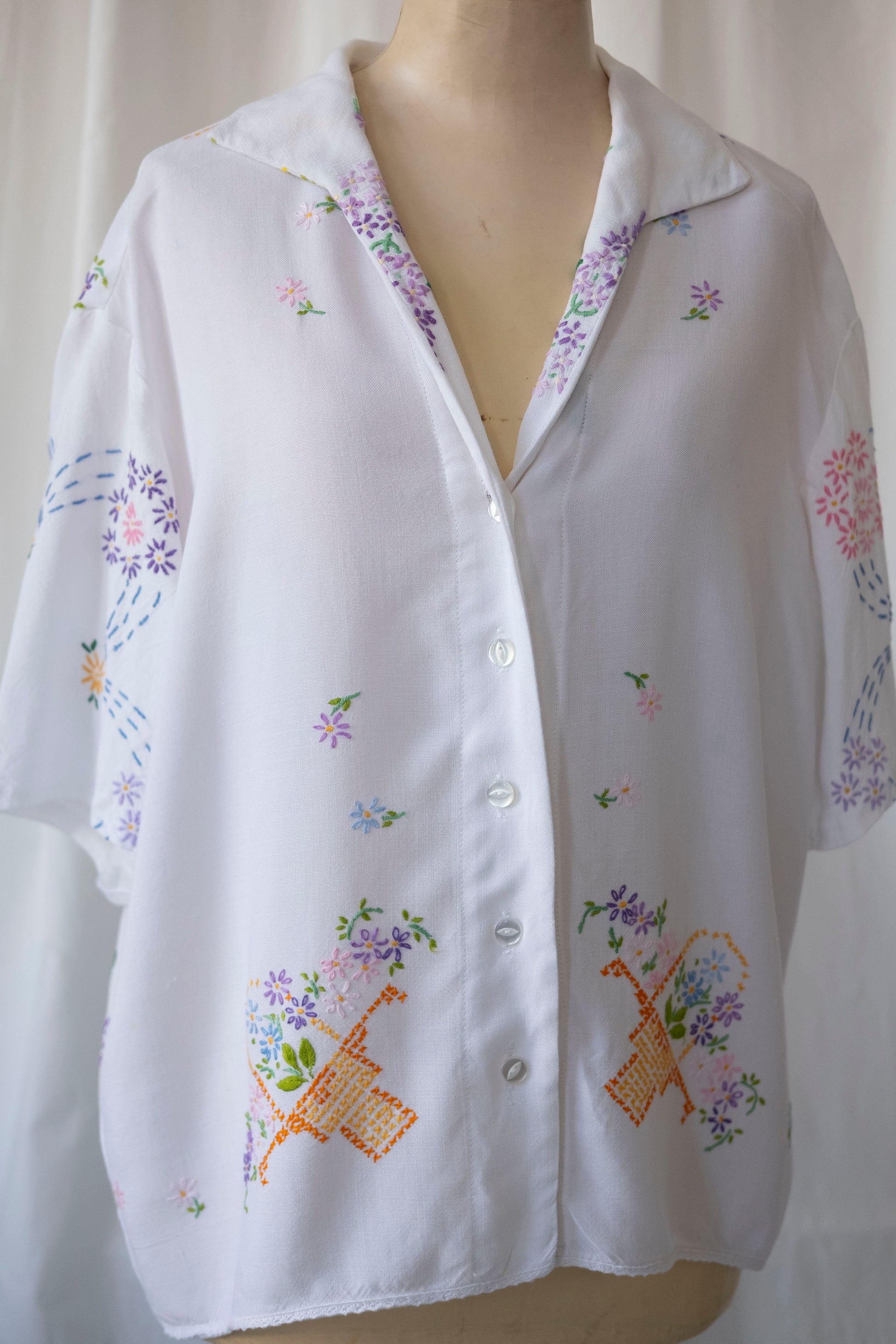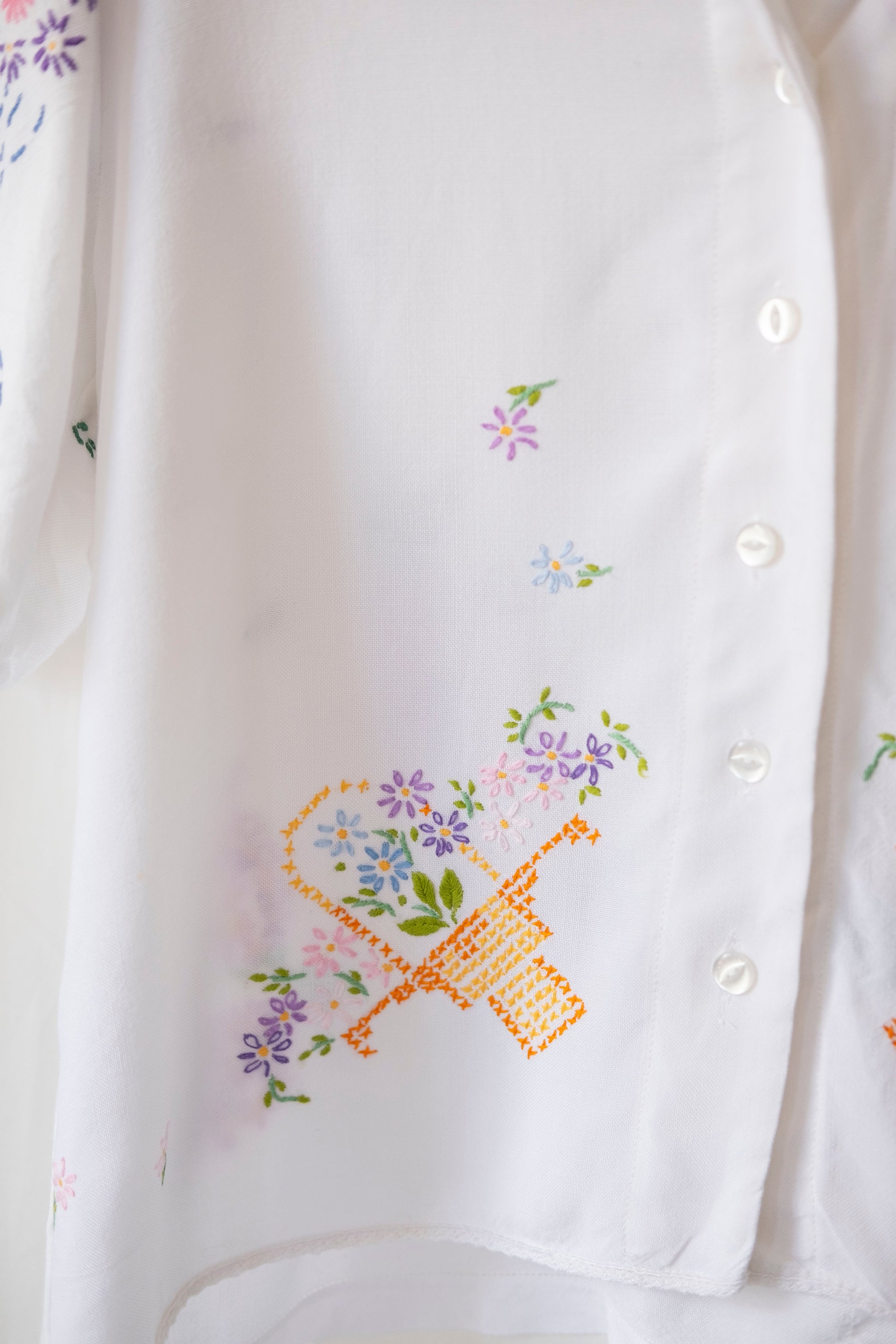 Quality floaty cotton, in white with pretty embroidered flowers & baskets.