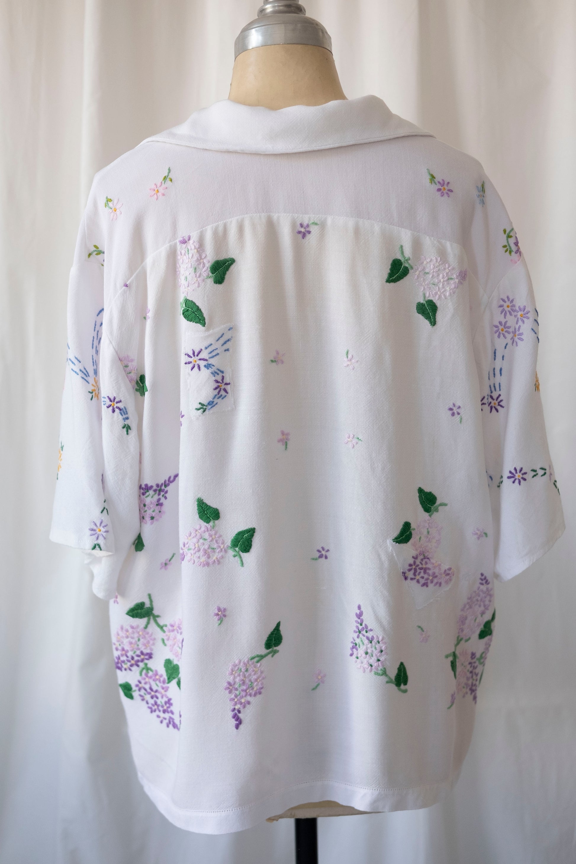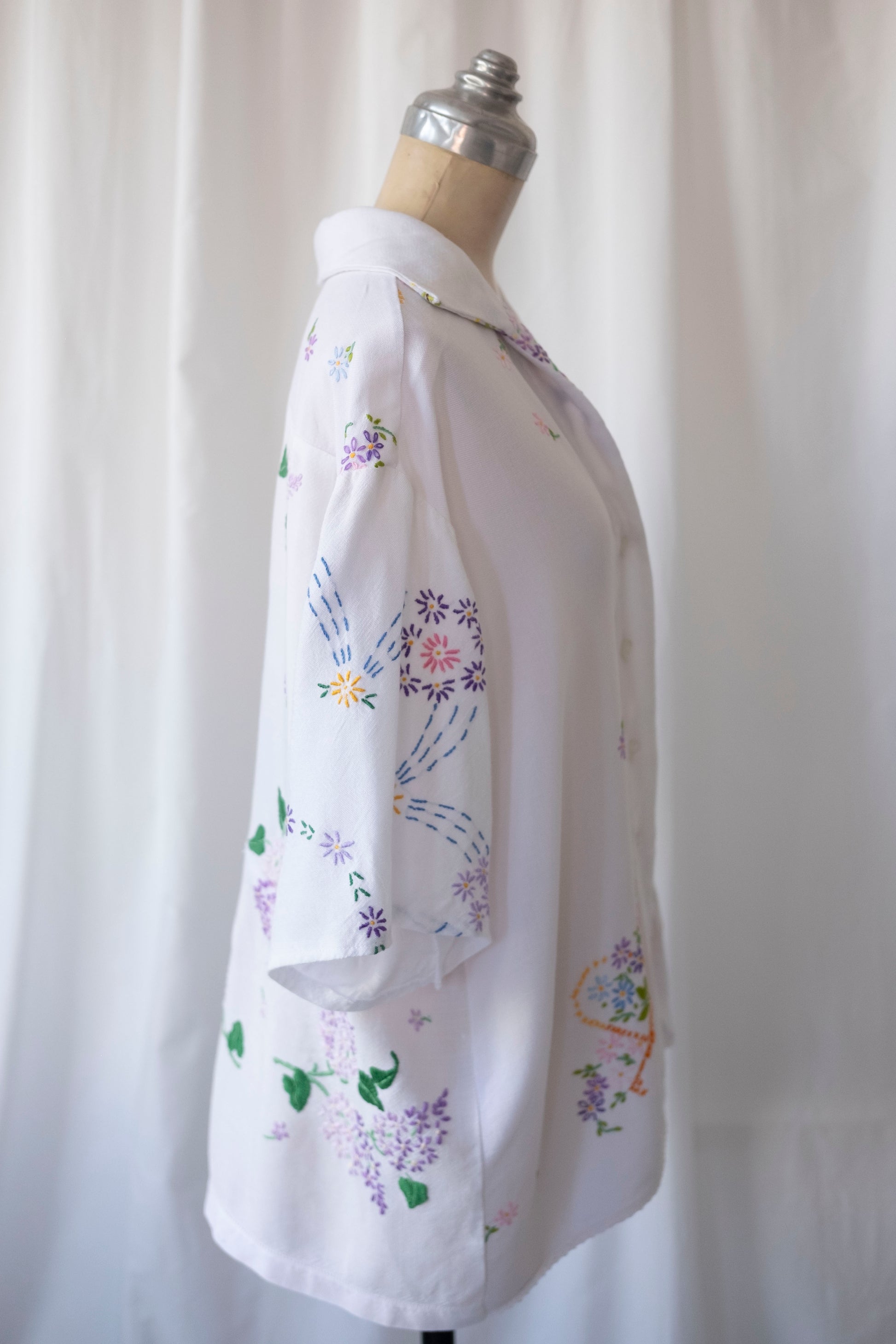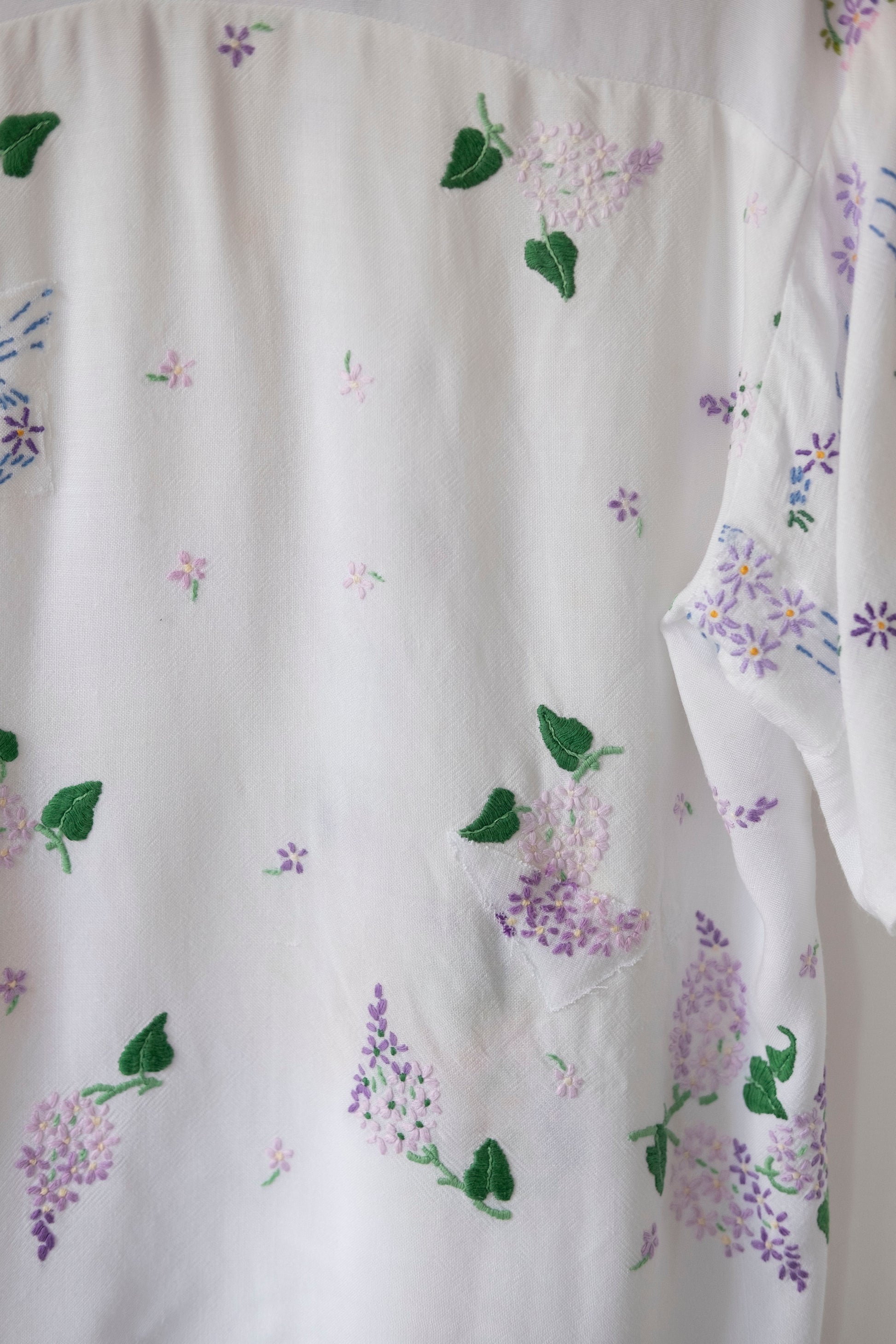 Quality floaty cotton, in white with pretty embroidered flowers & baskets.