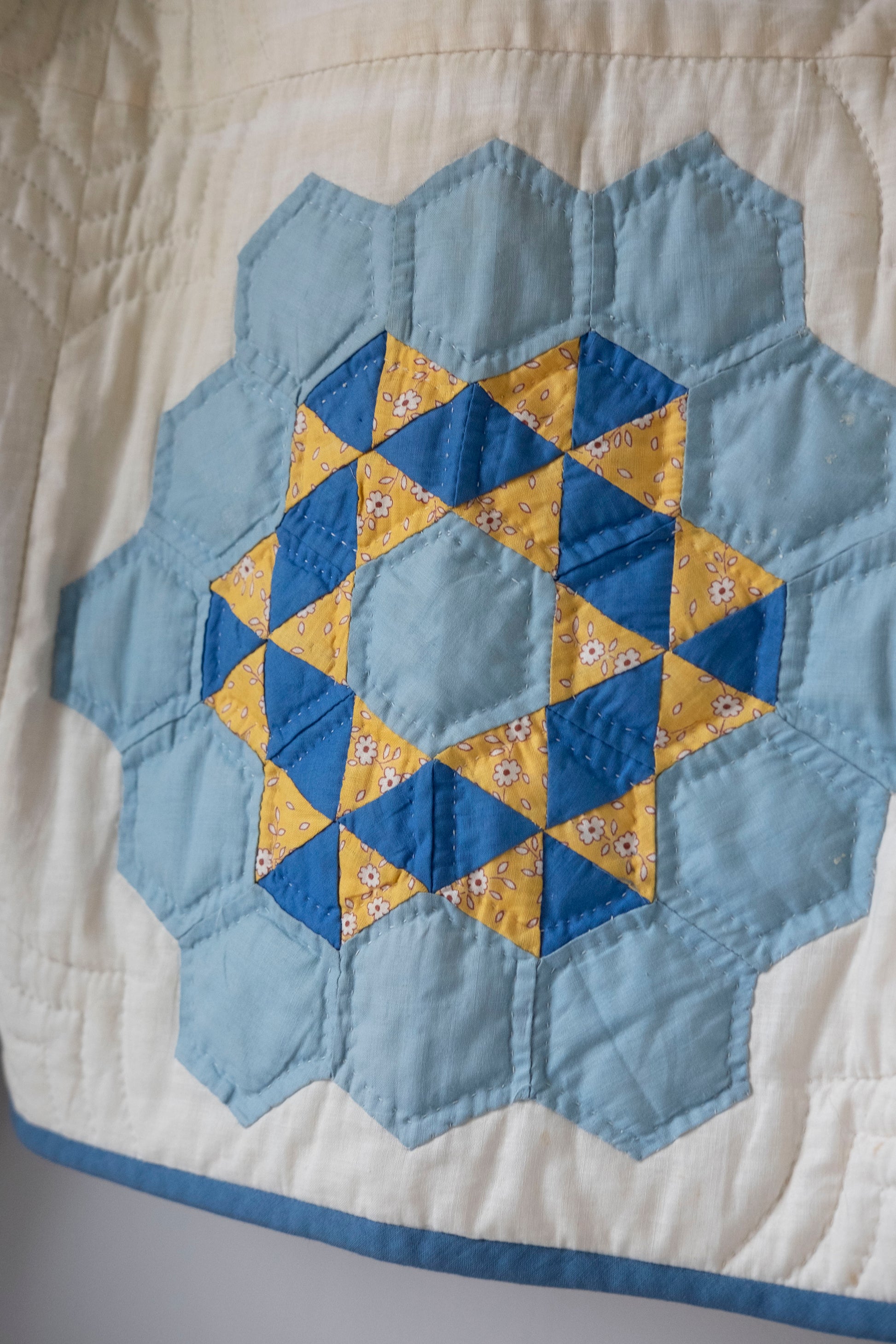 Quality cotton with grandmother's flower garden patchwork patterns in the nicest sky blue and yellow colourway, with blue binding to hems.
