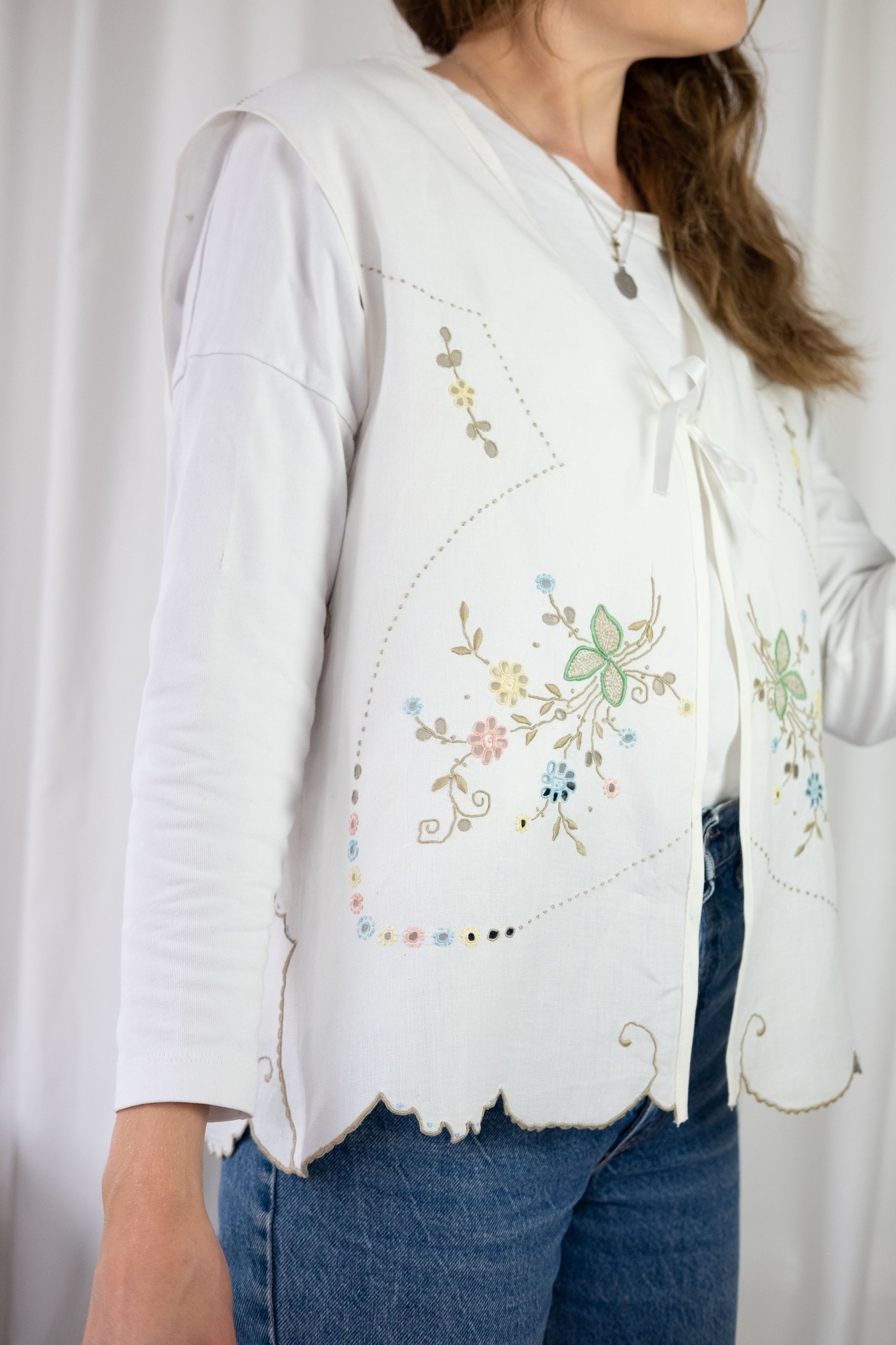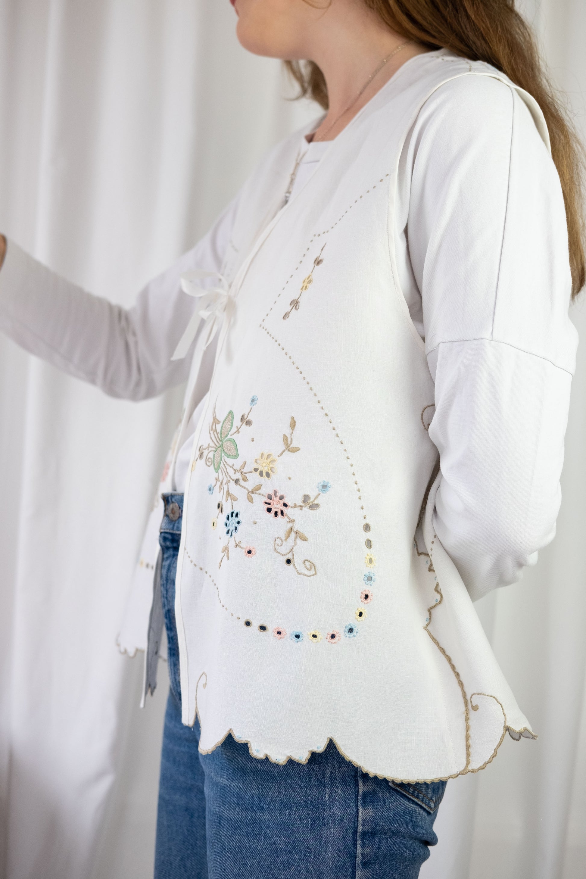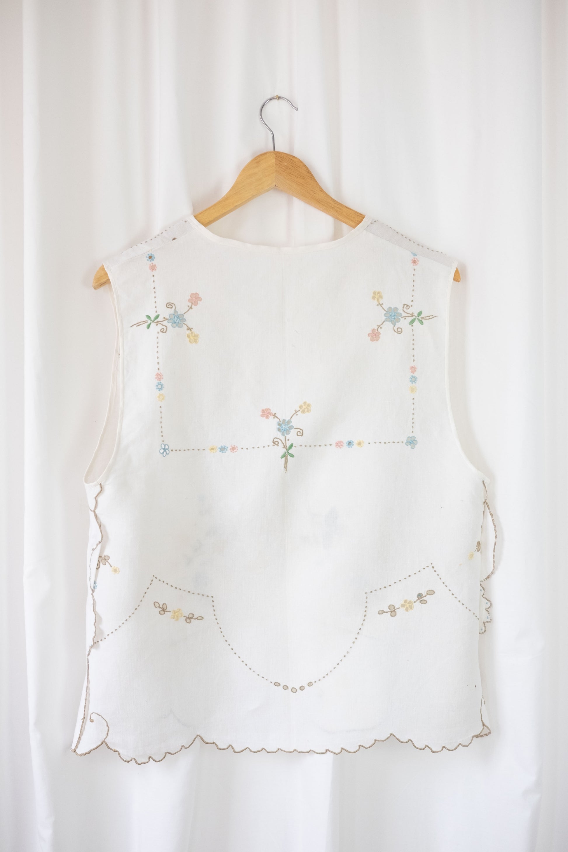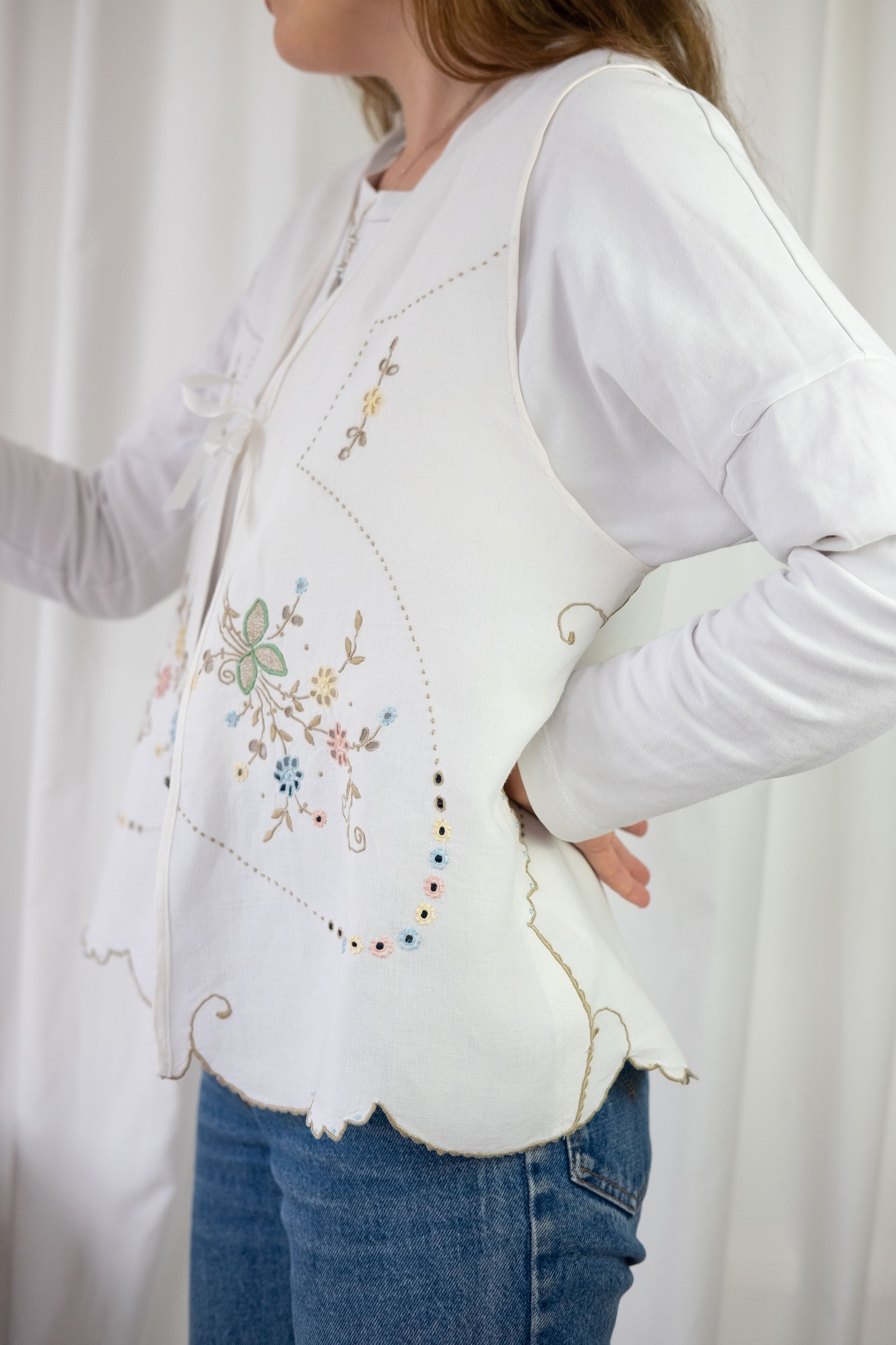 Sweet Pea ~ Reworked Vintage Linen Embroidered Waistcoat - M