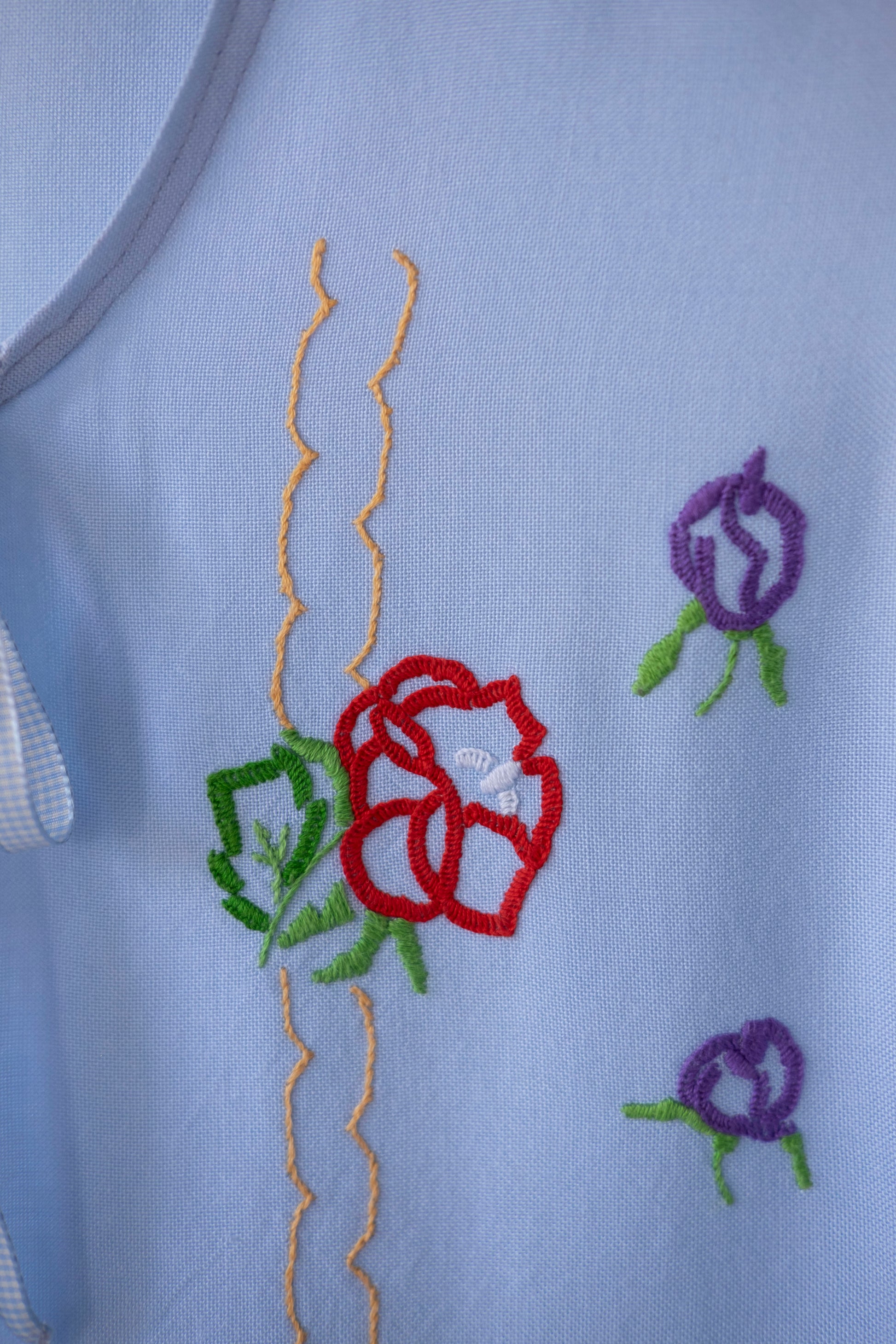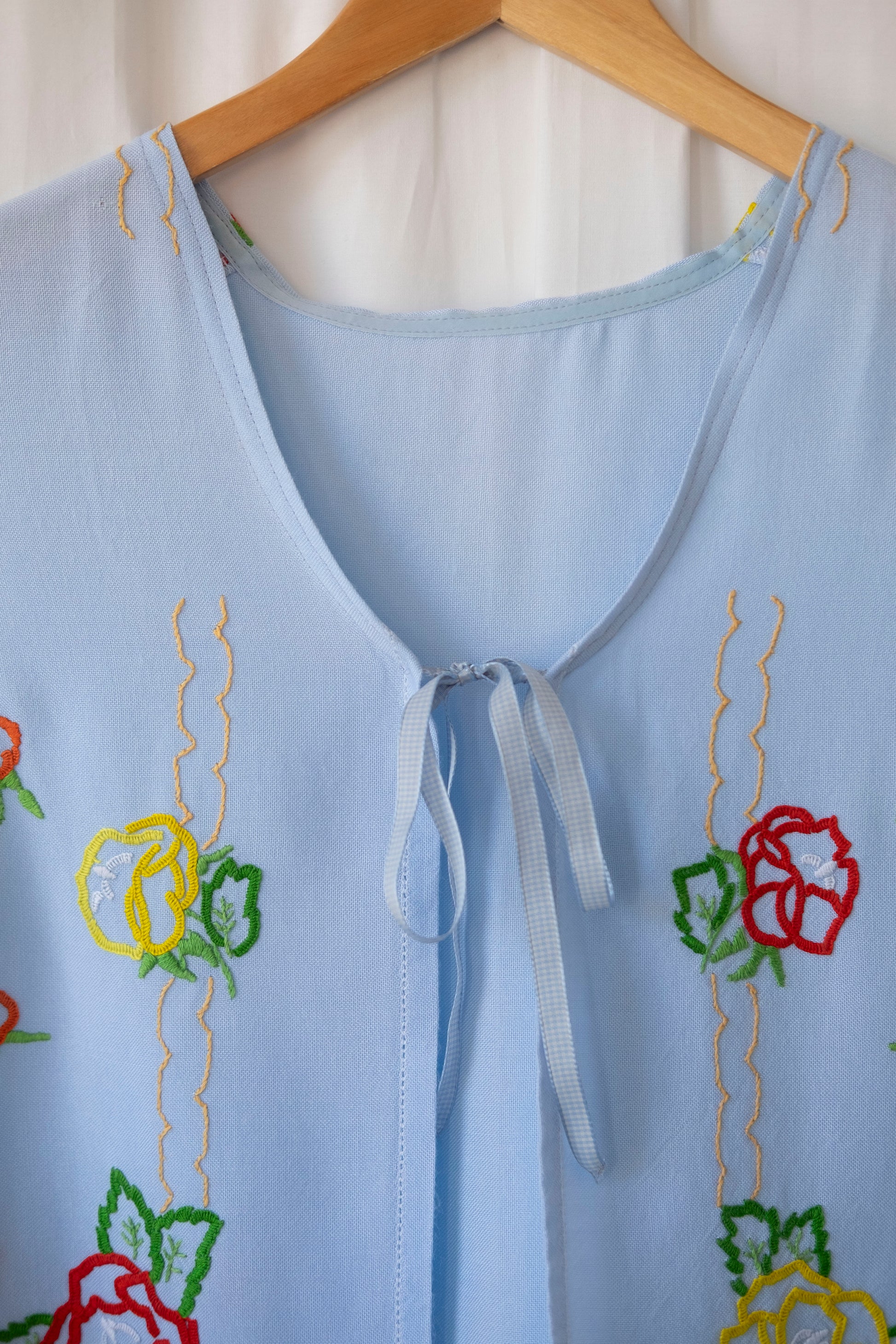 Quality floaty cotton in pastel blue with pretty hand embroidery.
